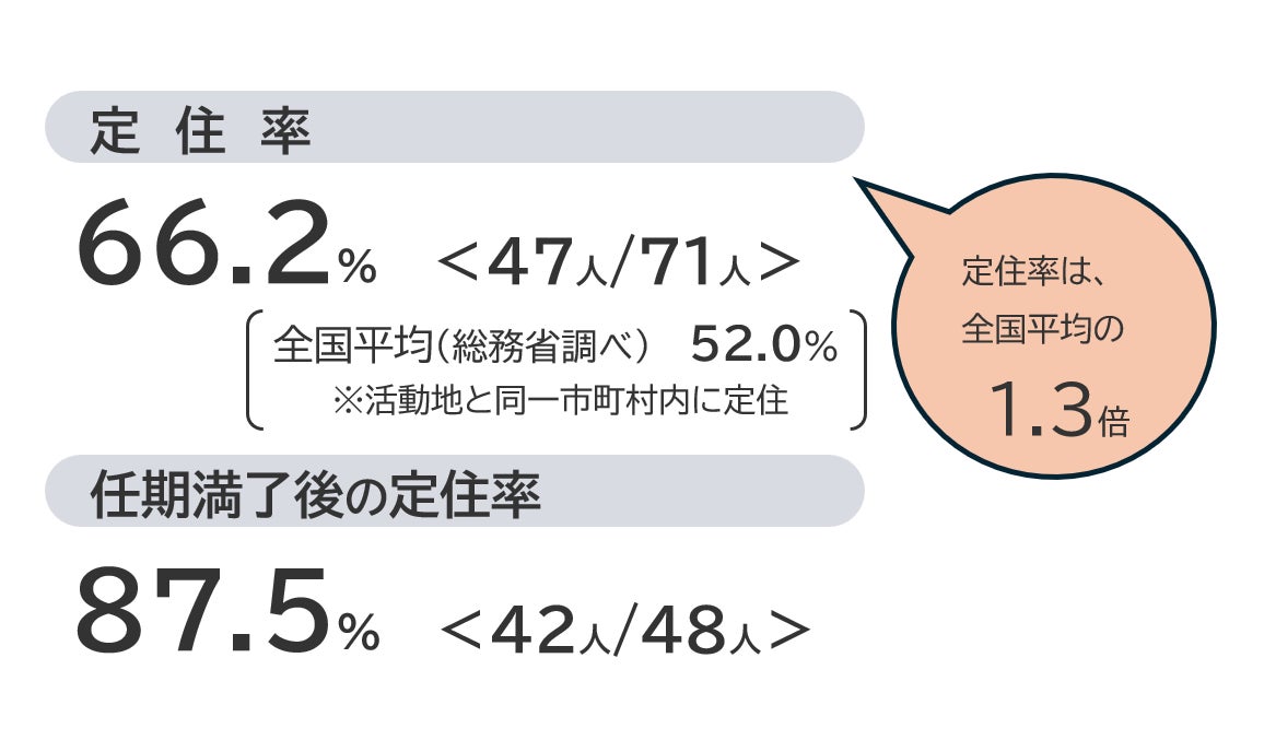 これまで任期を終えて卒業した71人の隊員のうち、47人が起業等により市内に定住しており、全国平均が約半数であるのに比べ、66.2%と高い定住率を誇っています。