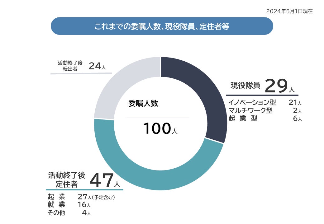 現役隊員数は29人、 活動終了後の定住者数は47人、 活動終了後の転出者数は24人で、定住率は66.2%(47人/71人)となっています※全国平均は52.0%