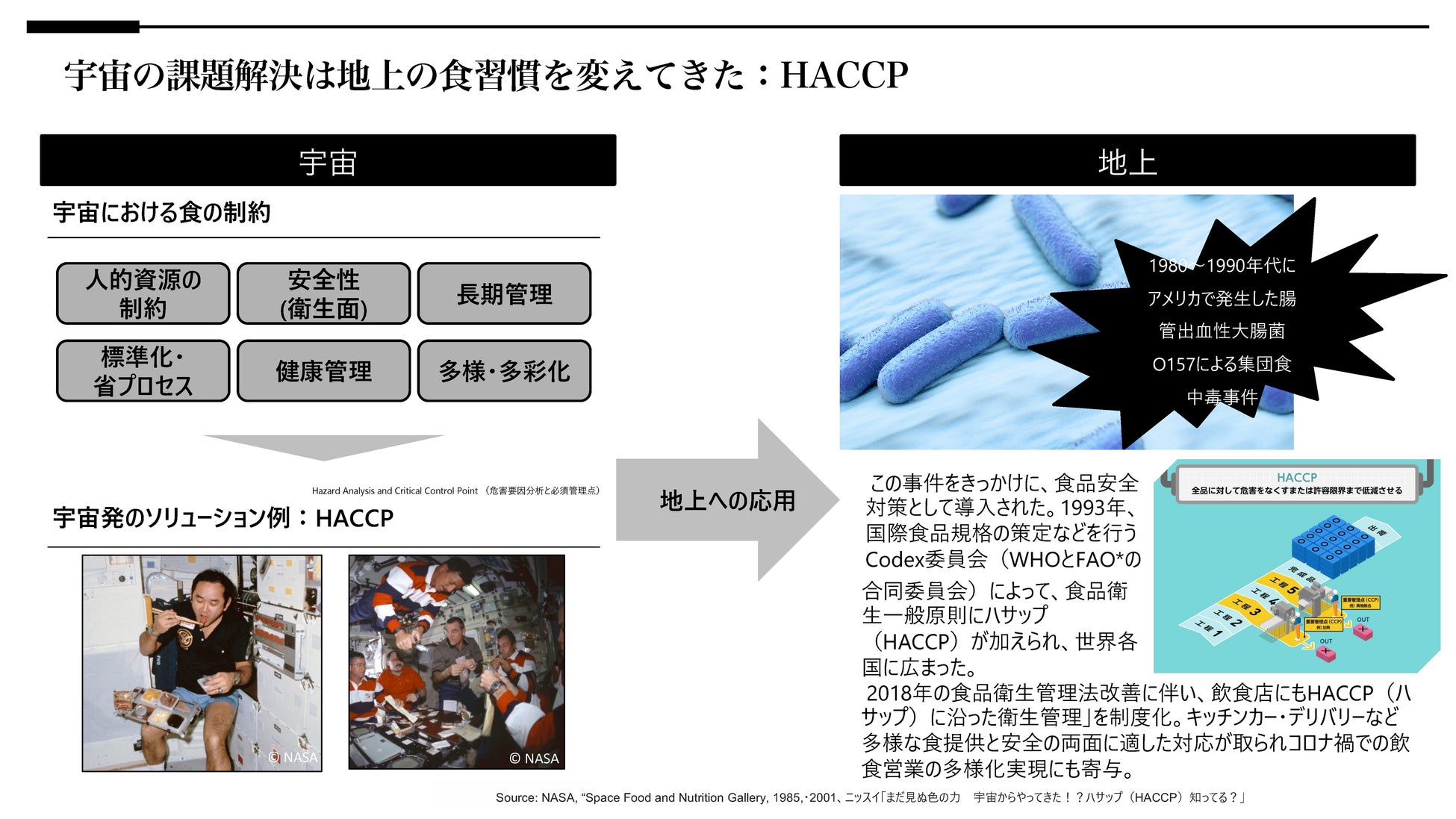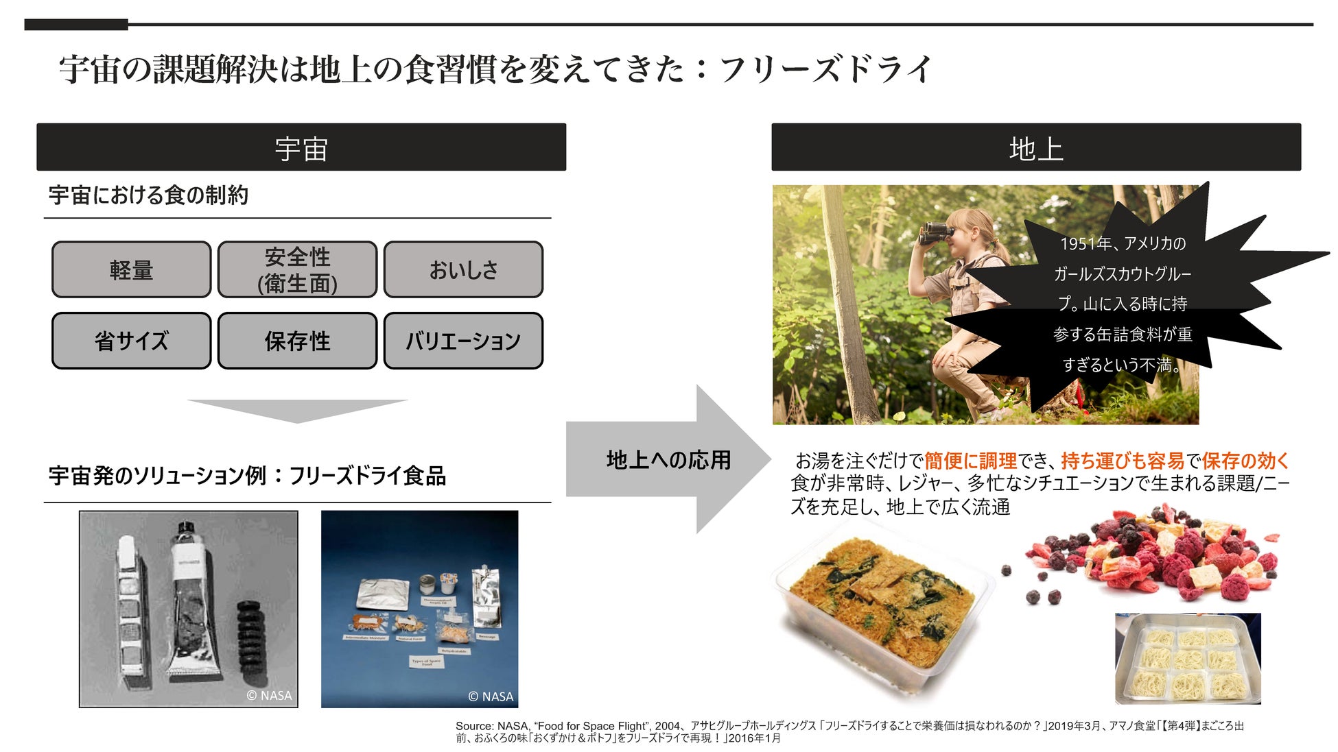 宇宙で生まれた食関連のソリューションが地上で活用されたケースで特に有名なものが、「フリーズドライ」と「HACCP」です。宇宙における食事の多様性を実現するために生まれたフリーズドライ技術ですが、アメリカのガールズスカウトグループが山に入る時に、持参する缶詰食料が重すぎるという不満から地上での食事に応用されたのがフリーズドライ技術です。お湯を注ぐだけで簡便に調理でき、持ち運びも容易で保存の効く食が非常時、レジャー、多忙なシチュエーションで生まれる課題/ニーズを充足し、地上で広く流通しました。