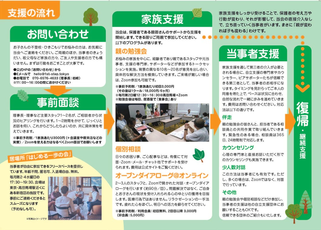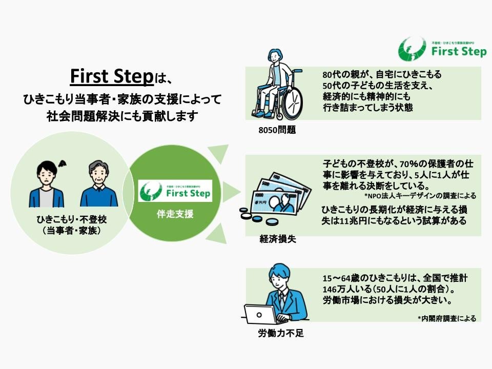 FirstStepは、不登校・ひきこもりの親(家族)の相談事業に力点を置いて、当事者の自立を支援するNPO法人です。中核スタッフの過半はピアサポーター(元当事者やその親)で、相談者のやりきれない気持ちを理解しやすい人たちです。そのスタッフたちの活動を有資格者などのスタッフたちが援護射撃してくれています。豊富な経験にもとづく柔軟な発想と行動で、困っているみなさんの「はじめの一歩」を応援します。