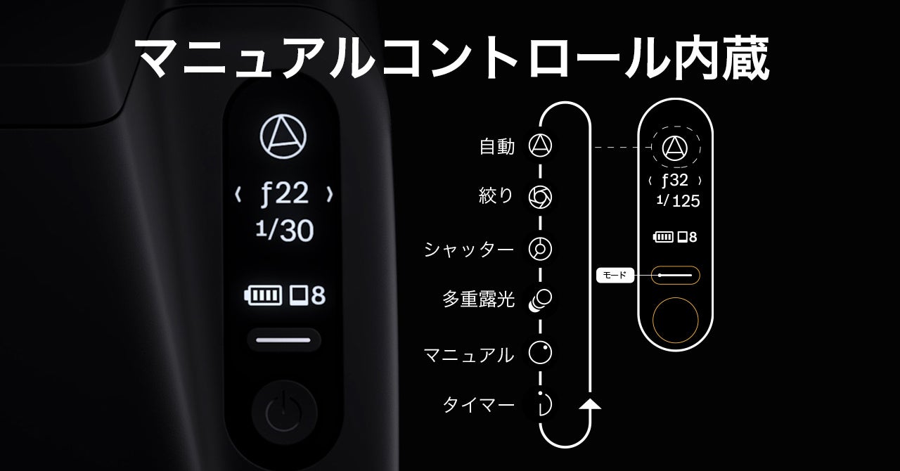 オート、絞り優先、シャッタースピード優先、多重露光、マニュアル、セルフタイマーを設定できます。