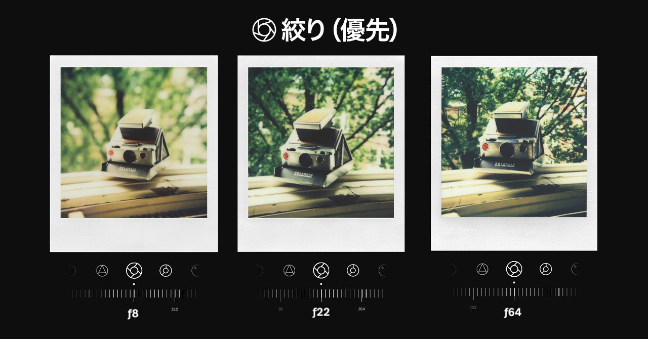 ②絞り優先:f8 、f11、f16、f22、f32、f45、f64を設定できます。背景のぼやけた写真からシャープな写真を撮影できます。