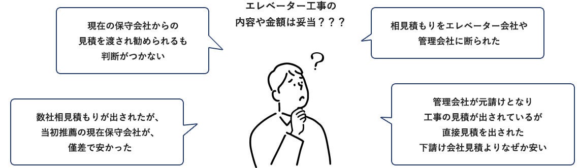 エレベーター保守会社や管理会社から提案されたリニューアル工事について、現場に即した適切な施工業者と工事仕様で相見積もりを取得し、同等仕様での比較検討に伴った内容説明、業者選定への助言とサポートによるコンサルティング業務を行います。