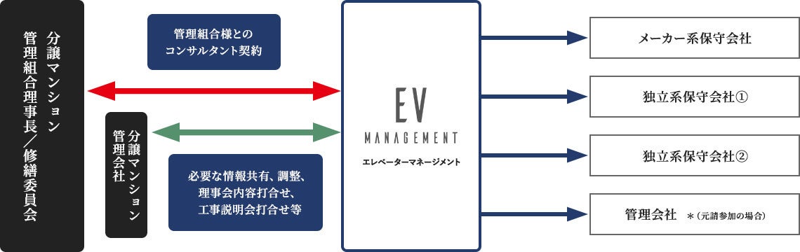 エレベーターマネージメントは、全国90万台以上稼働しているエレベーターの保全管理を、大手含め数百社あるエレベーター製造会社、保守会社と専門知識を持ち合わせていない管理組合役員様、賃貸マンションオーナー様を何よりも顧客目線と現場重視の観点よりコンサルティングから、ベストマッチングさせる日本で唯一の存在として誕生しました。