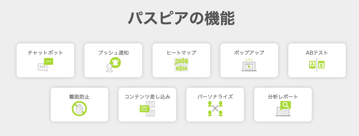 パスピアでは、チャットボットに加えて、ヒートマップ、プッシュ通知、ポップアップ、コンテンツ差込、離脱防止の機能が搭載されました。