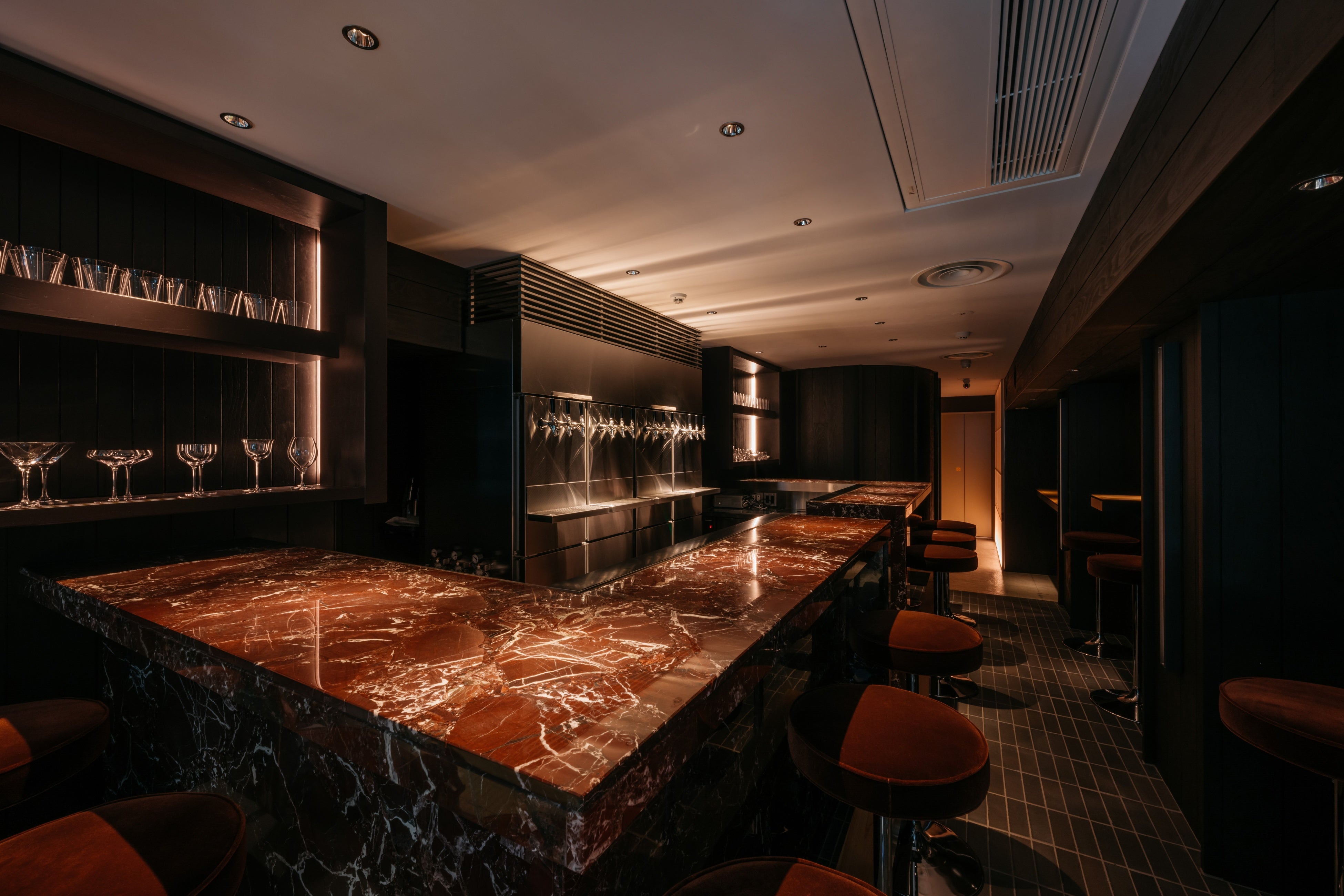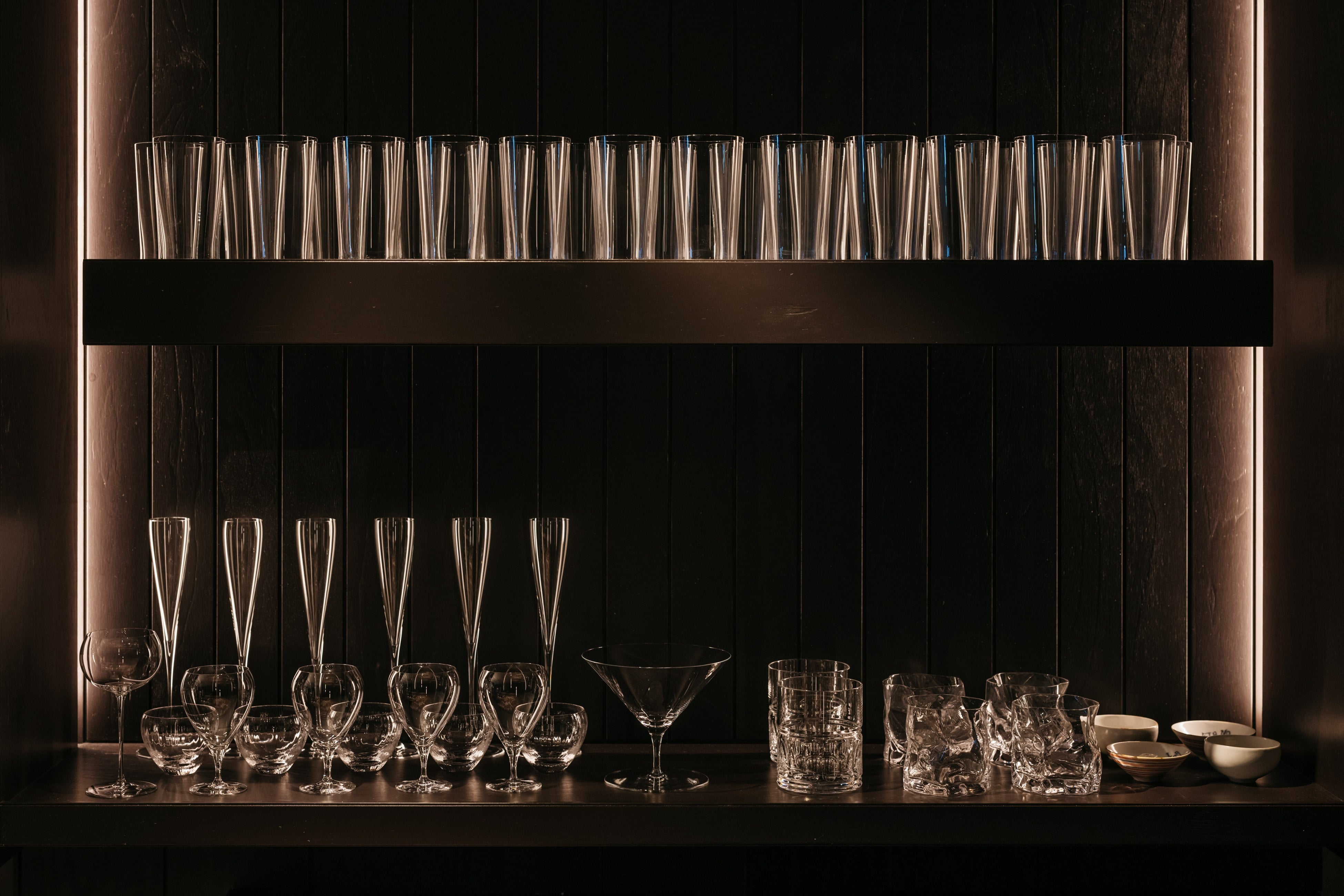 「HYBE Design team」が手がけるインテリアデザインは、茶室のような“和”の設計手法に石やステンレスなど現代的な素材を掛け合わせ、相反する要素が一つの空間の中で共存することで、二重構造体の美や楽しさを生み出しました。店内には、カウンター、個室、テーブル席に加えてスタンディングシートを備え、肩肘張らずカジュアルにご利用いただけます。