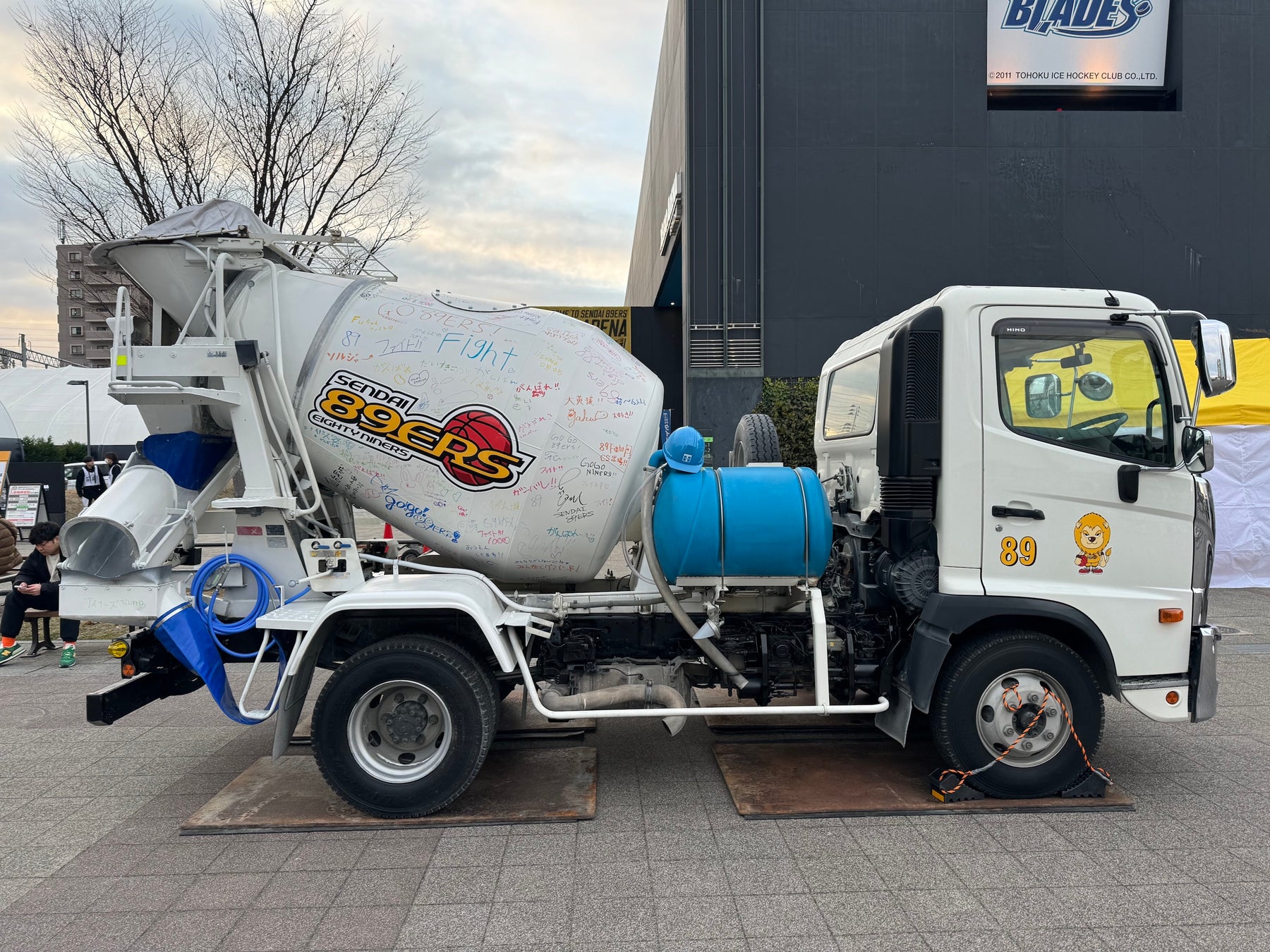 イエロースポンサースポンサーを務める「仙台89ERS」のロゴでラッピングした生コン車に、地元の子どもたちからの“黄”援メッセージを集め、チームを応援しました。