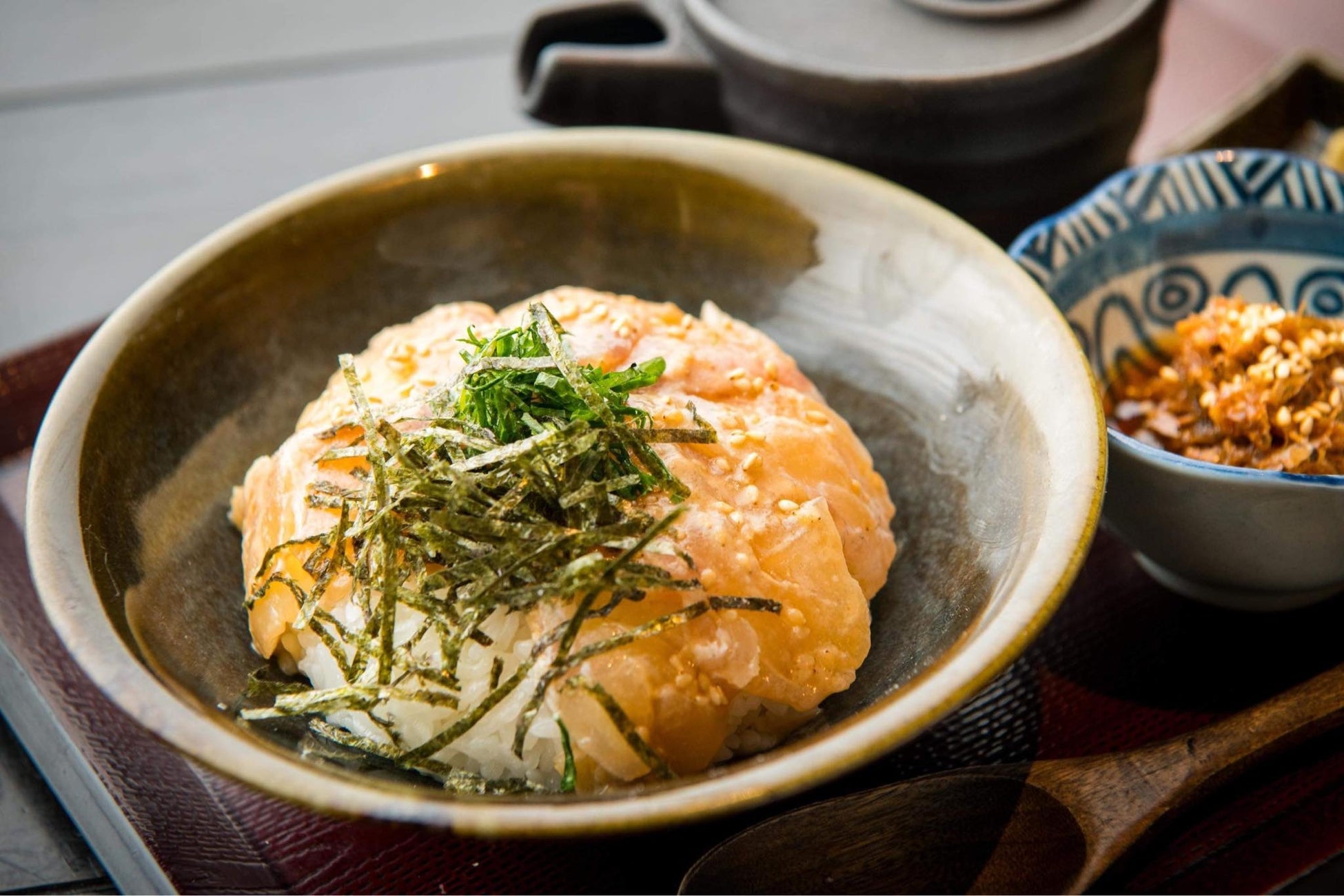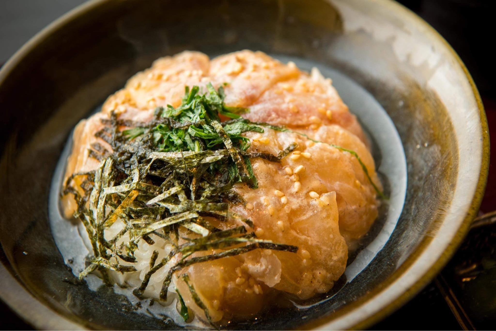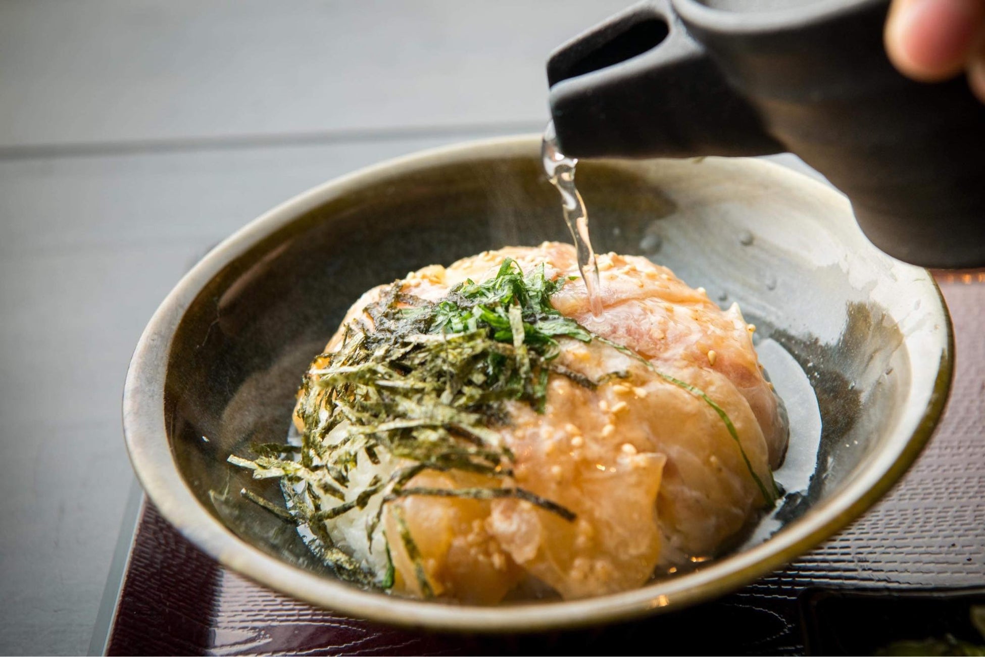 潮の干満差が大きい天草周辺の海域で、速い潮流にもまれた育った熊本天草産の養殖マダイを使用。身が引き締まりうまみがある真鯛をごま漬けにし、ごはんの上にトッピング。そのまま丼として、またお出汁をかけて、二度おいしいオリジナルの鯛茶漬けです。