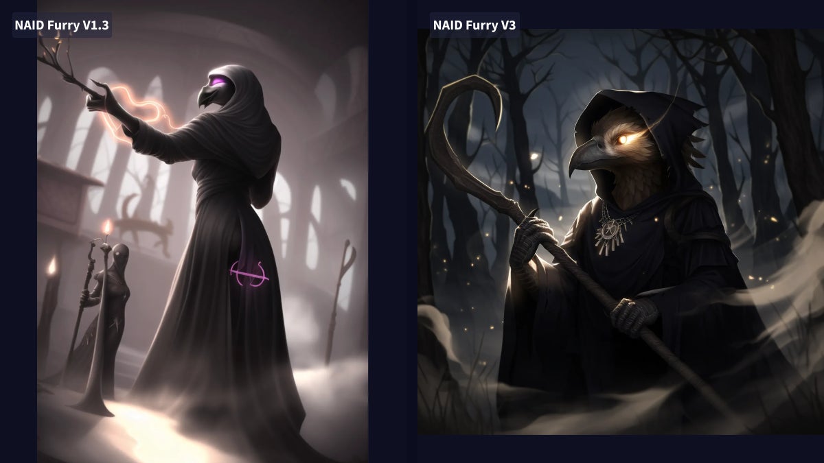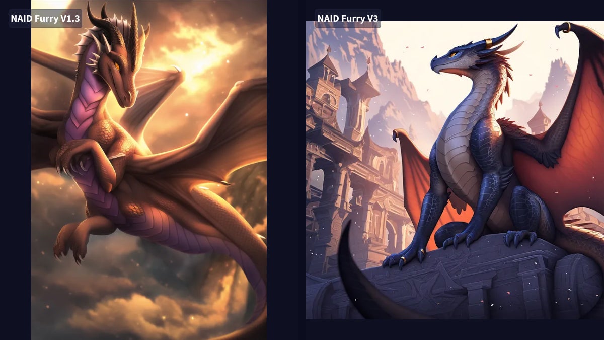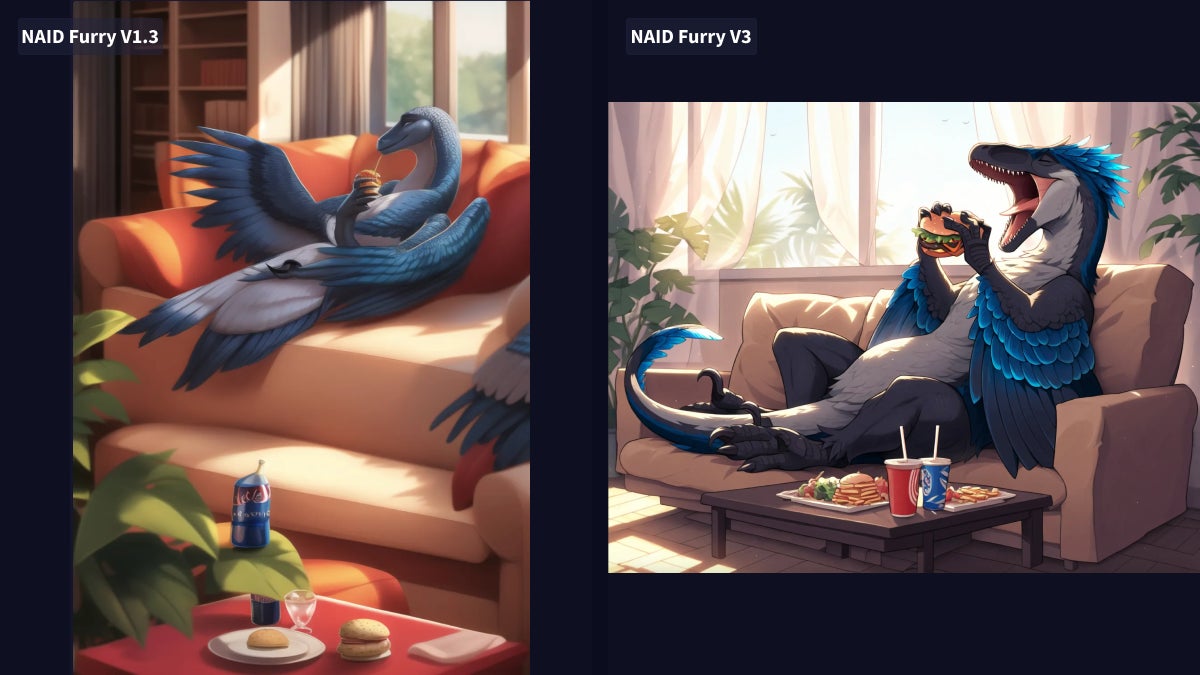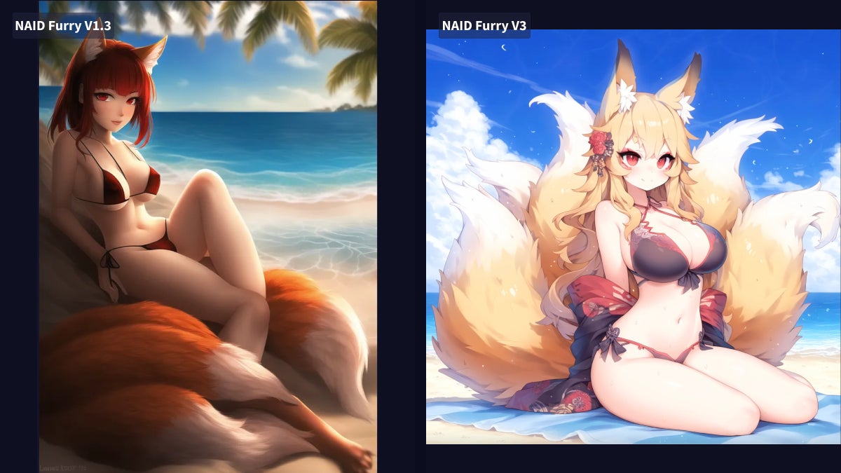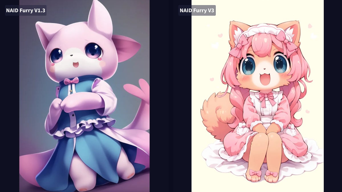 以下は、「NovelAI Diffusion Furry V1.3」モデルと最新の「NovelAI Diffusion Furry V3モデル」の比較画像です。さらに、新モデルの性能を示すための追加画像もご覧いただけます。