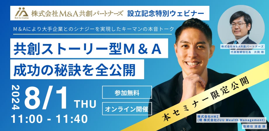 Cloud Link Group株式会社(本社:東京都港区、代表取締役社長:梅野 且貴、以下「クラウドリンクグループ」)は、M&A仲介事業を行う株式会社M&A共創パートナーズ(本社:東京都港区、代表取締役社長:片岡 翔、以下「M&A共創パートナーズ」)を設立し、事業を本格開始したことをお知らせいたします。また、2024年8月1日に「共創ストーリー型M&A 成功の秘訣を大公開」と題して、株式会社ZUU Wealth Management(※2023年1月31日に株式会社AWZから商号変更 本社:東京都目黒区、代表取締役社長:髙木 貴行、以下「ZUU Wealth Management」)と共催ウェビナーを開催いたします。