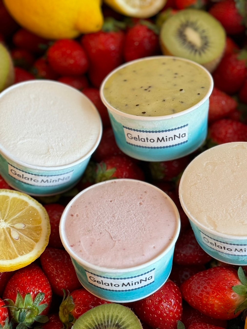 体に優しく、⼼に優しく、環境にも優しい、新鮮なジェラートでみんなが笑顔になるジェラートを作っています。⼈⼯的な添加剤や乳化剤を使わず、旬の果物やフレッシュな⽣乳など、⽣産者が育てた素材を⼤切に扱い、素材そのものの味をシンプルに生かす。⾃然由来の材料を使ったつくりたてのジェラートは、Gelato MinNaのこだわりがたくさん詰まっています。
