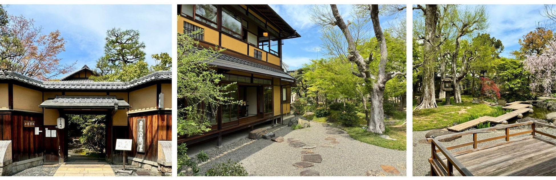 数寄屋風書院造りの建物には、国産拇材(ぼざい=ツガ)が使われ、襖の取手や釘隠しにも独創的な金物が施されるなど、当邸が檉一郎氏の京都での交友関係の拠点として力を入れて建てられたことが伺えます。 また、お庭には建築以前から自生していたものと思われる樹齢百五十年を超える椋の大木や、新たに本家西尾八ッ橋が八ッ橋の由来として再現しました「かきつばたの池」などをご覧いただけます。