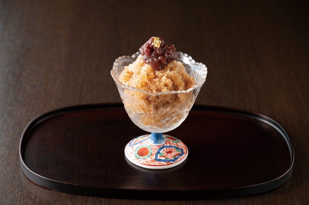 特製のお汁粉を冷やし、水まんじゅうを浮かべました。見た目も涼やかな水まんじゅうのプルリンとした食感と良く合います。
