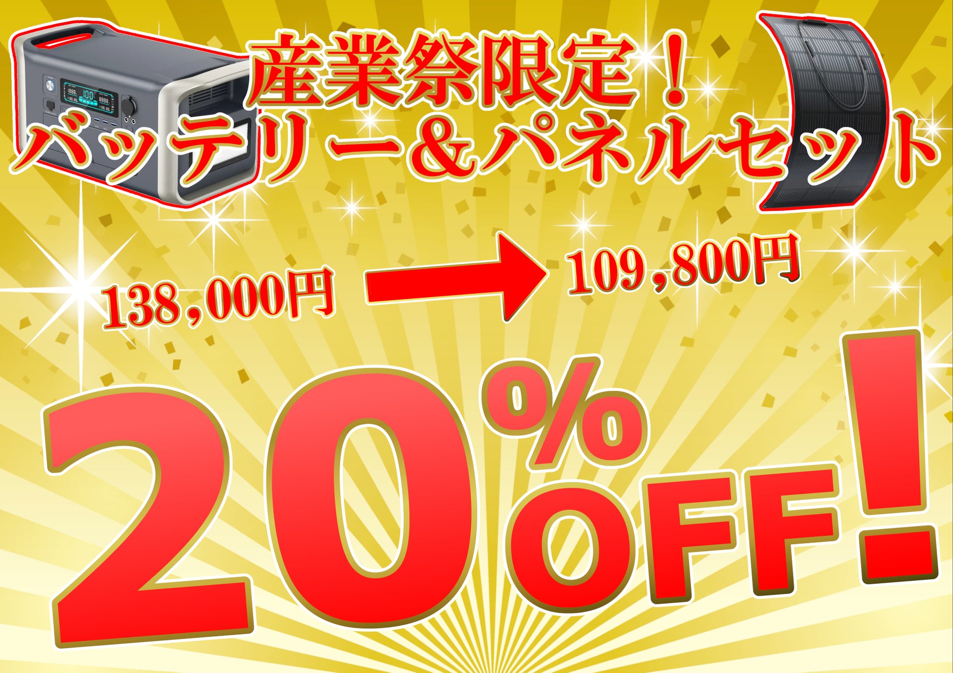 産業祭大特価といたしまして、ミニバッテリーとパネルのセット商品を販売しております。