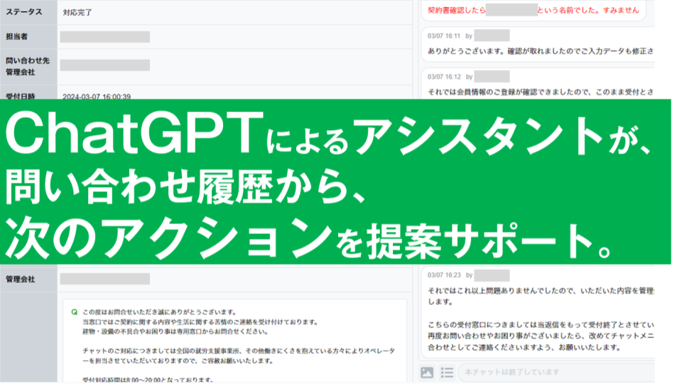 本プロジェクトで利用するチャットシステムは独自開発しました。開発は株式会社ソニックガーデンが行い、問い合わせごとの案件管理に加えて、ChatGPTを利用した問い合わせ支援機能により、問い合わせ内容の要約や、次に行うべき対応方法の提案などを実装しています。働く人を強力にサポートする機能によって、よりスピーディな業務参画を可能にしています。