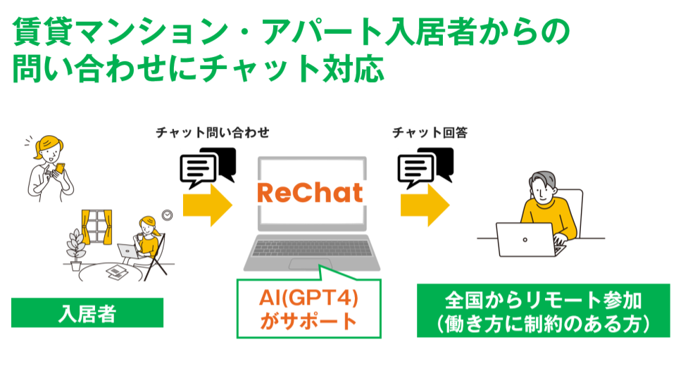 第一弾の業務としては、賃貸マンション・アパートの管理問い合わせ・対応を受け付ける株式会社リペアサービス(北海道札幌市)より委託を受け、入居者の対応を行います。契約に関するお問い合わせや、修繕に関するお問い合わせを、チャットにより幅広い時間帯で受け付けることができます。