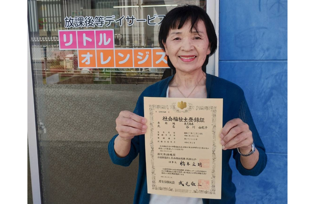 特定非営利活動法人リトルオレンジズ(所在地:鹿児島県鹿屋市、代表:日野 尚子、以下:リトルオレンジズ)は、「質の高い支援の一歩先へ」を目指し、職員の資格取得を推奨している。ここに勤める谷川由紀子さん(71)も、障がいがある子どもたちの支援をきっかけに、宮崎福祉医療カレッジ社会福祉士学科(通信課程)で学び、この学校で最高齢での社会福祉士資格取得となった。