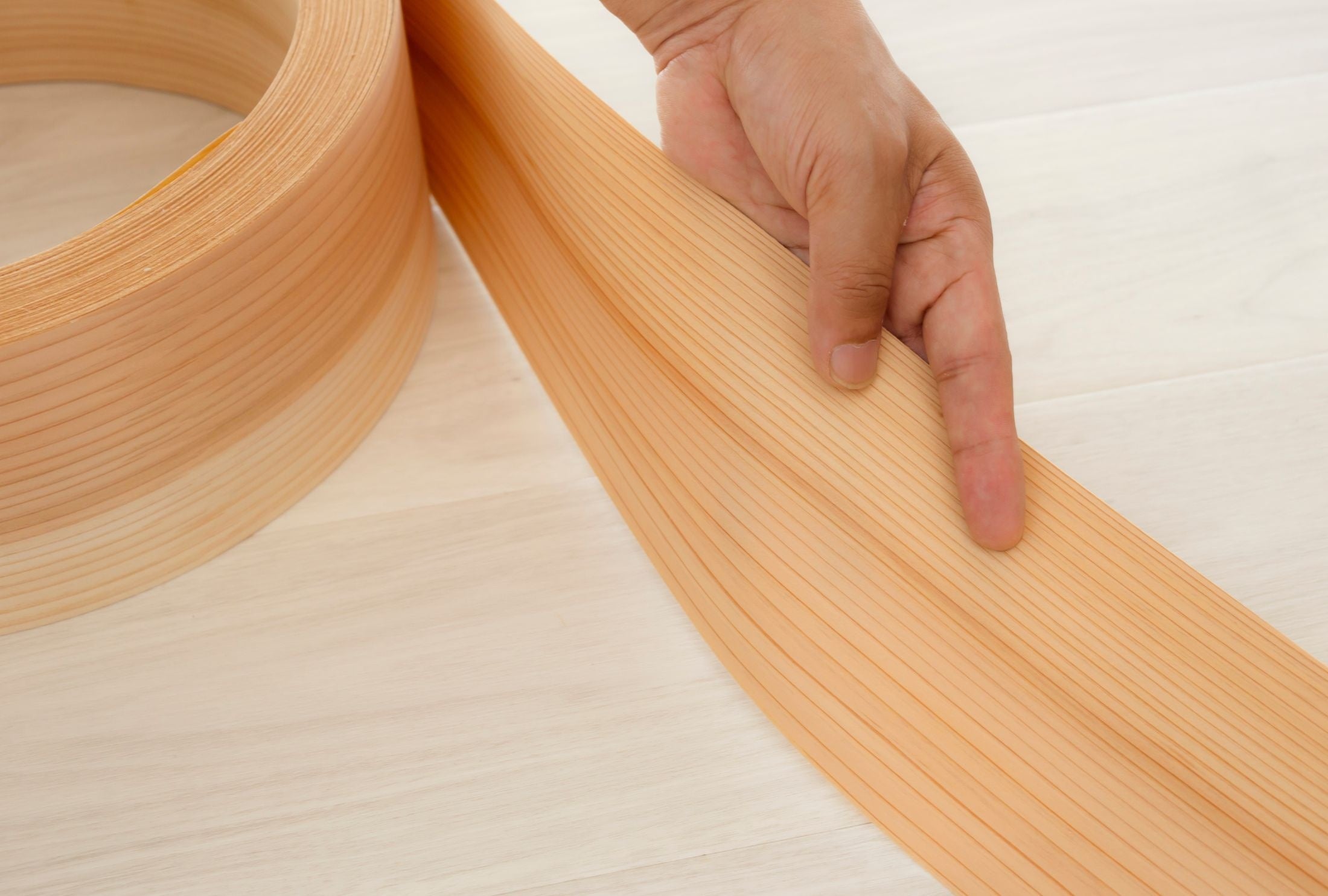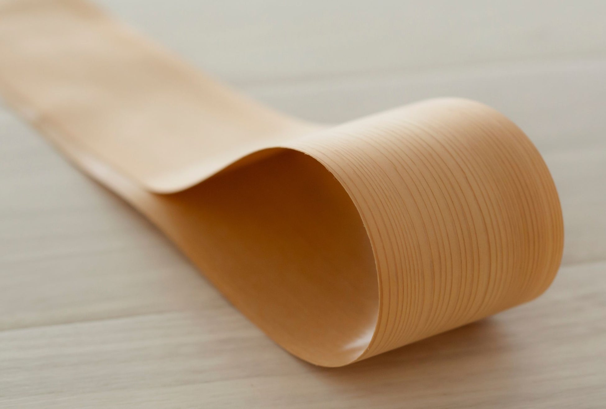 無垢材を薄くスライスして作られるツキ板用の木材は径が太く、通直で節の少ない材が必要です。「刺身で言うとトロの部分」を使っています。また、曲げたときに割れが出にくいように、まっすぐの木目部分のみを使用するため、歩留りよりも美しい木目が表面に出ることを優先して製材します。業務用のツキ板よりも、さらに薄くしなやかにする最終仕上げ工程を経てマスキングテープとなります。