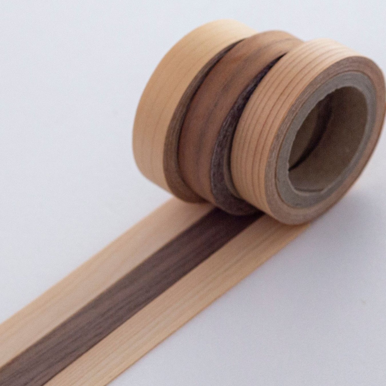 天然木による模様や柄という視覚的な魅力と呼吸する素材性の持つ機能性や手触り、質感をそのまま活かしてマスキングテープにしました。お手軽に本物の木材の質感を生活に取り入れることで、日々の暮らしを彩ります。