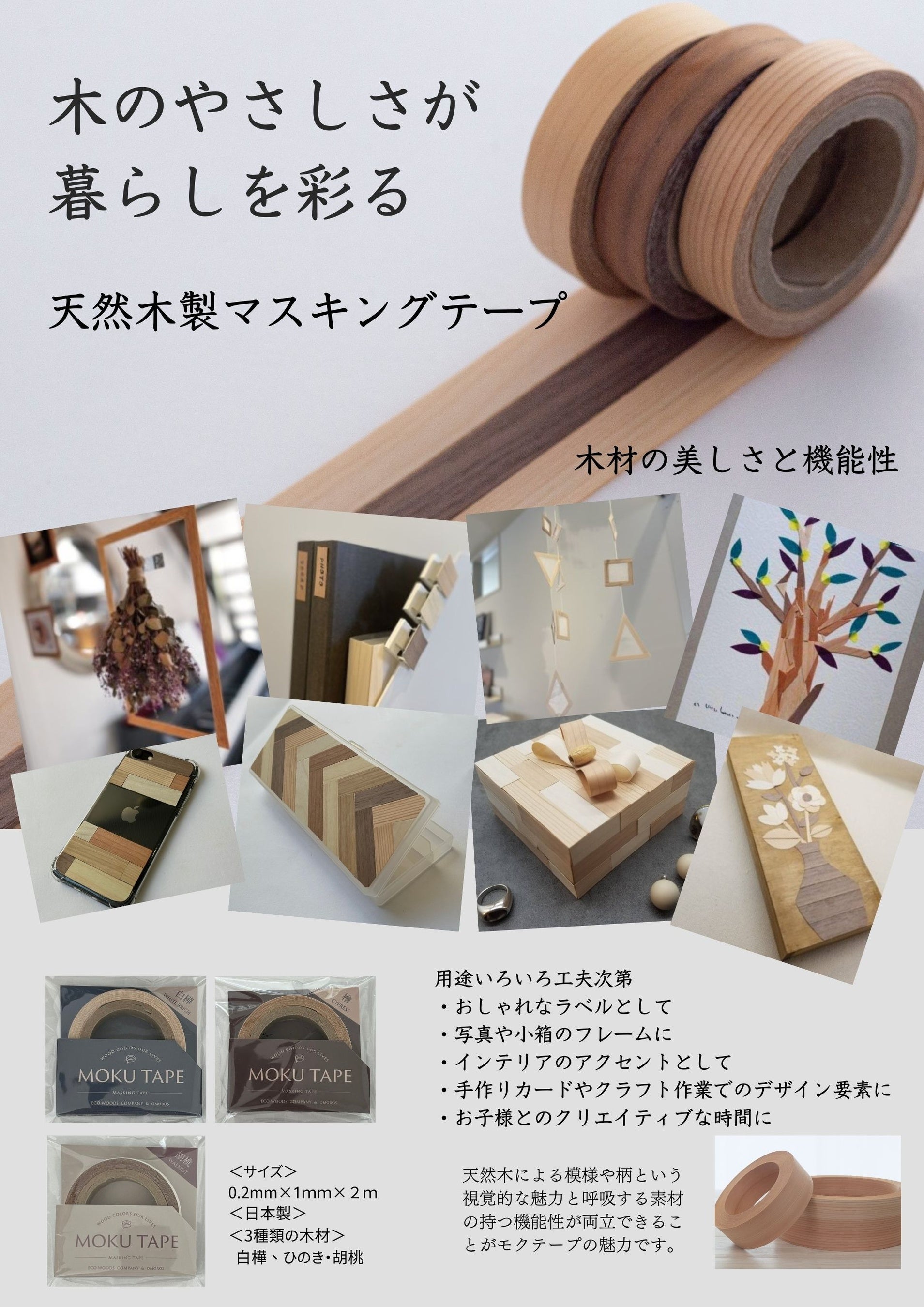 天然⽊の⽊⽬の美しさと貼って剥がせるマスキングテープの機能を兼ね備えたアイテムです。