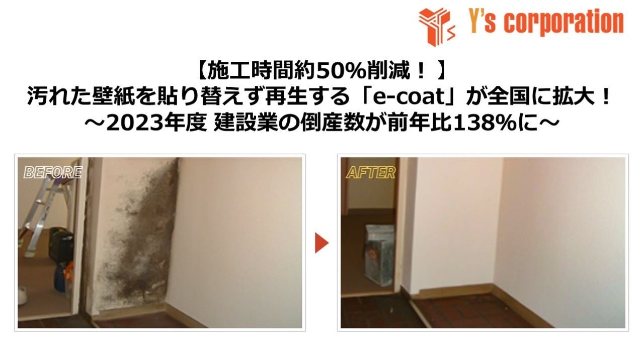 【施工時間約50%削減! 】汚れた壁紙を貼り替えず再生する壁面再生特許「e-coat」が全国に拡大!~2023年度 建設業の倒産数が前年比138%に~