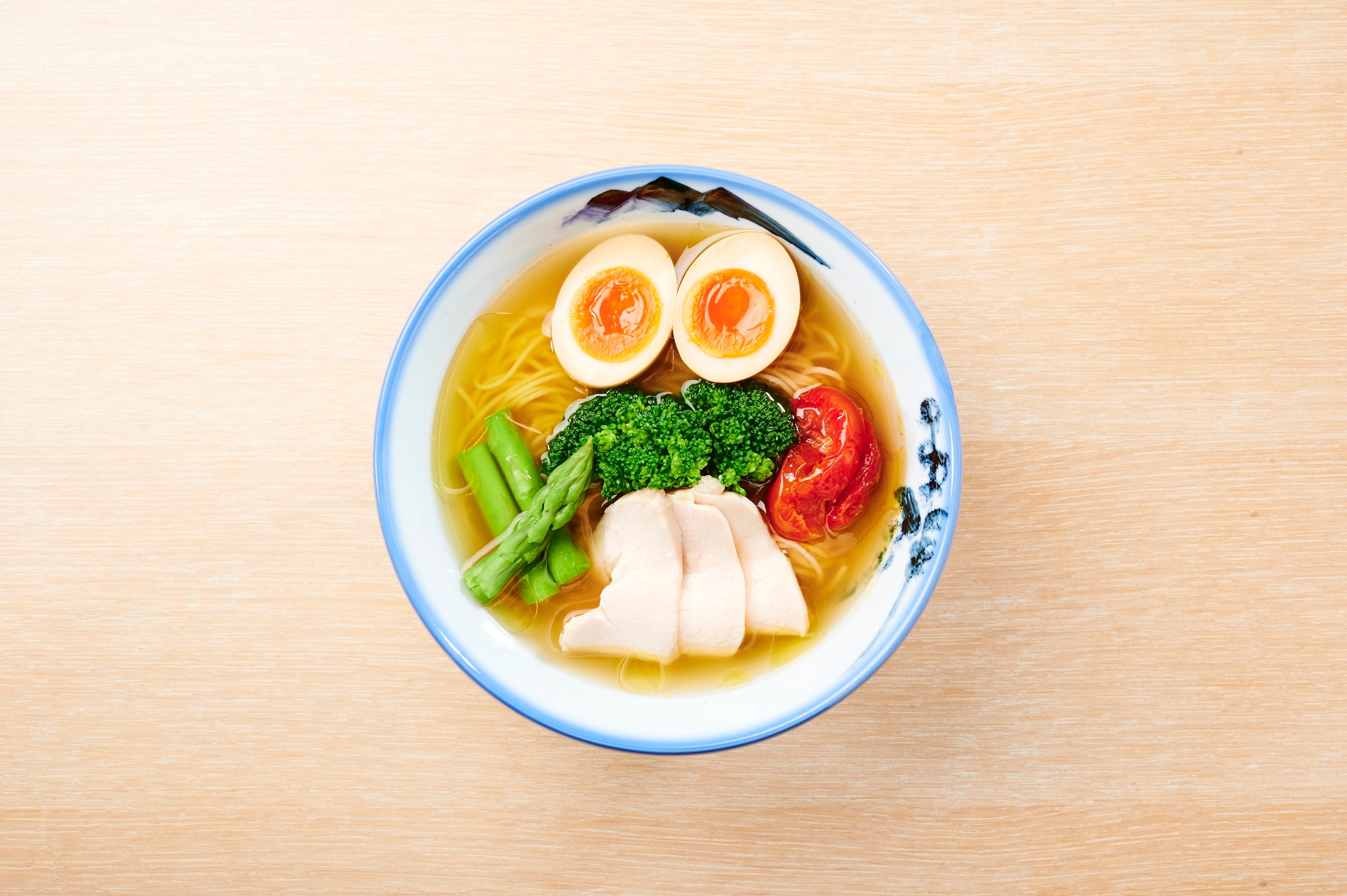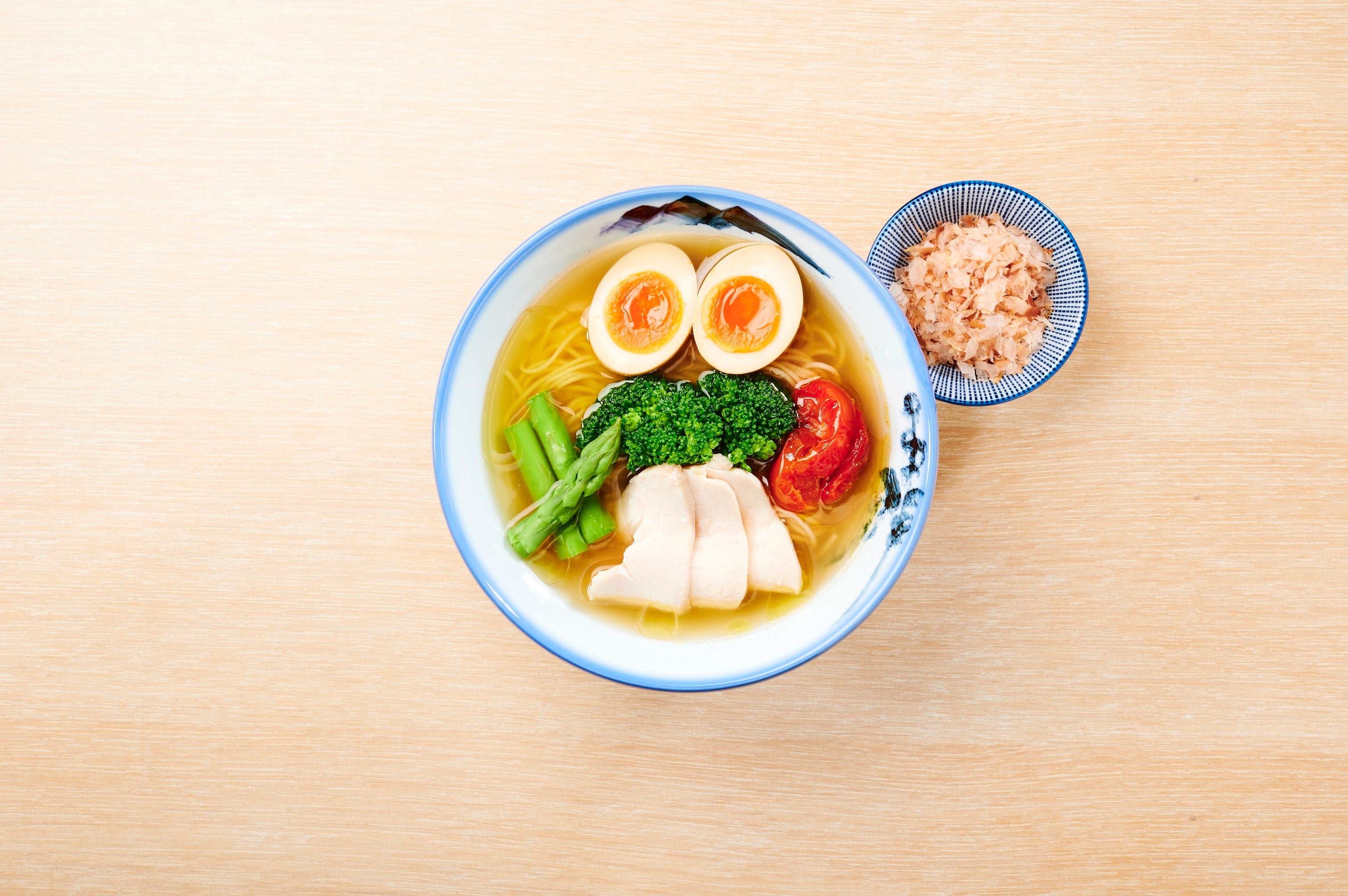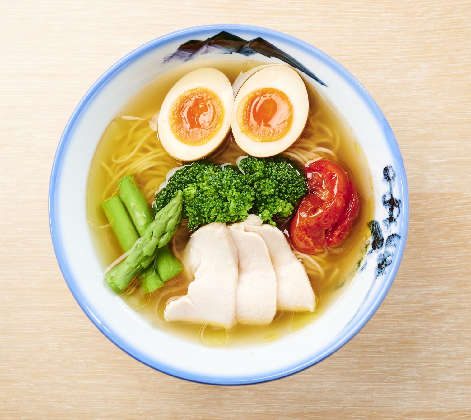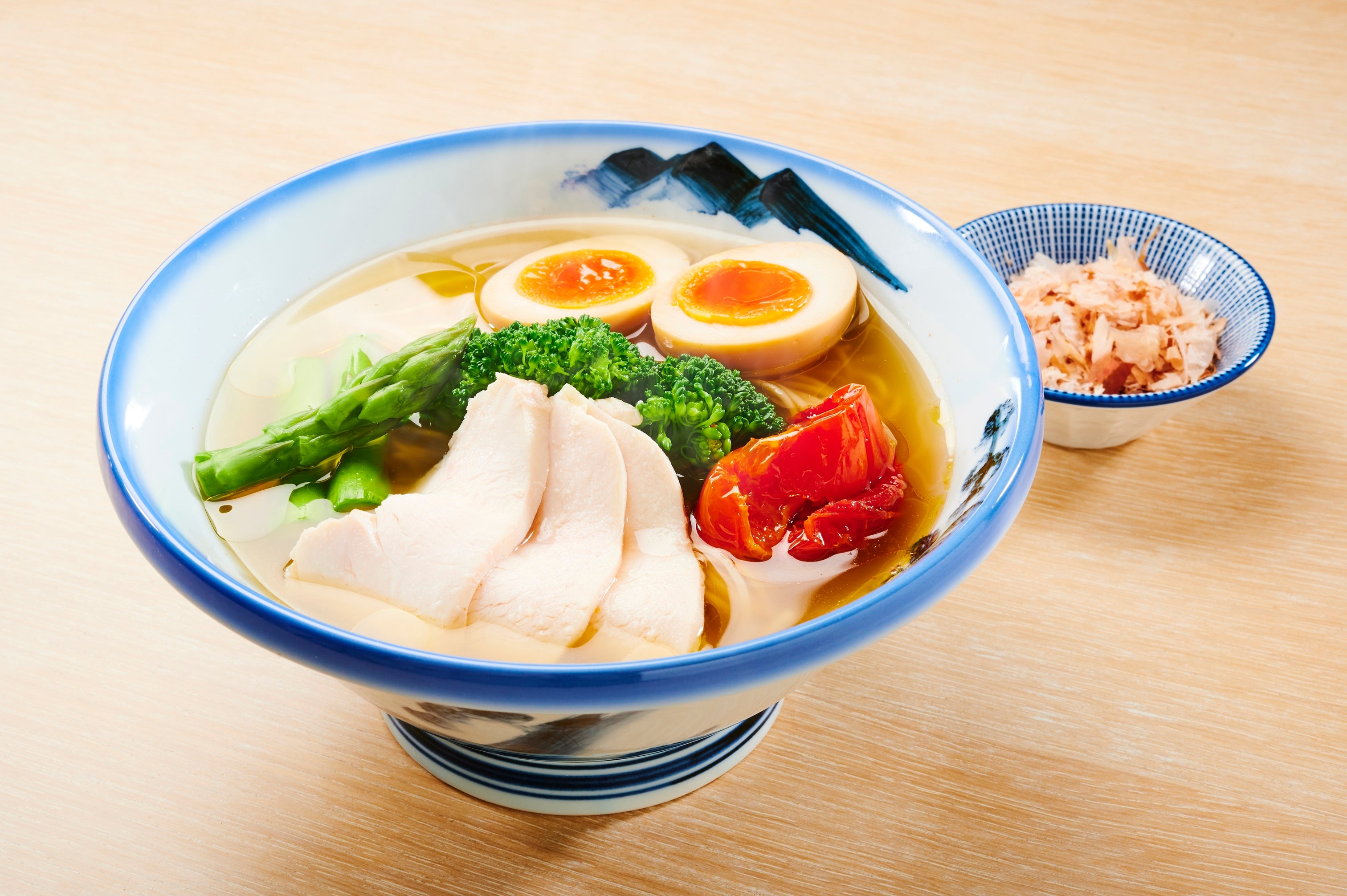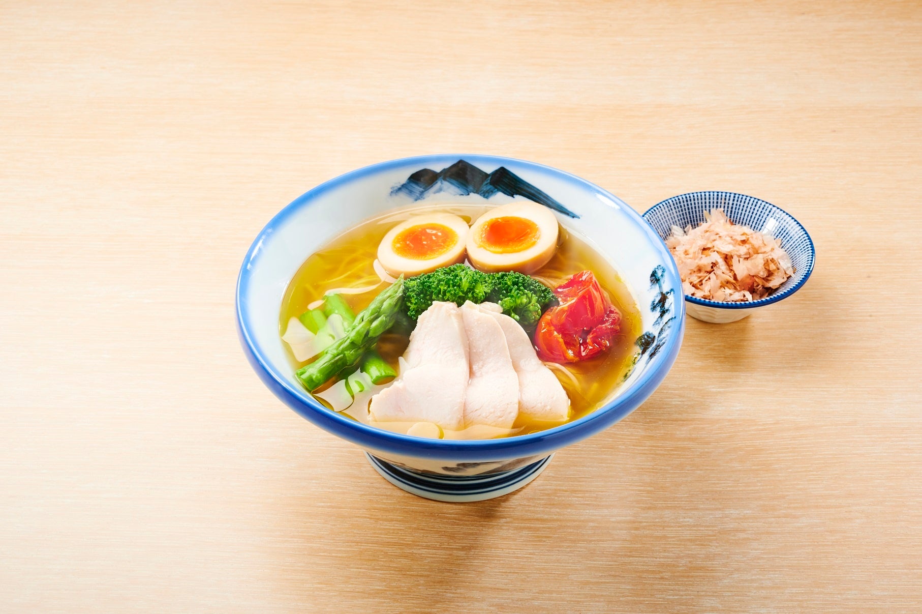 「AFURI」の看板商品である「柚子塩らーめん」の、黄金色に輝く淡麗スープを使用した、期間限定ラーメンが登場します。大豆を50%配合した低糖質・高たんぱく麺「キッコーマン 大豆麺 細麺」と、こだわりの5つの具材を組み合わせました。1食にたんぱく質45gを含み、通常の柚子塩らーめんと比較して、糖質は62%オフの “ヘルシーさとおいしさの両立”をテーマにしたラーメンです。