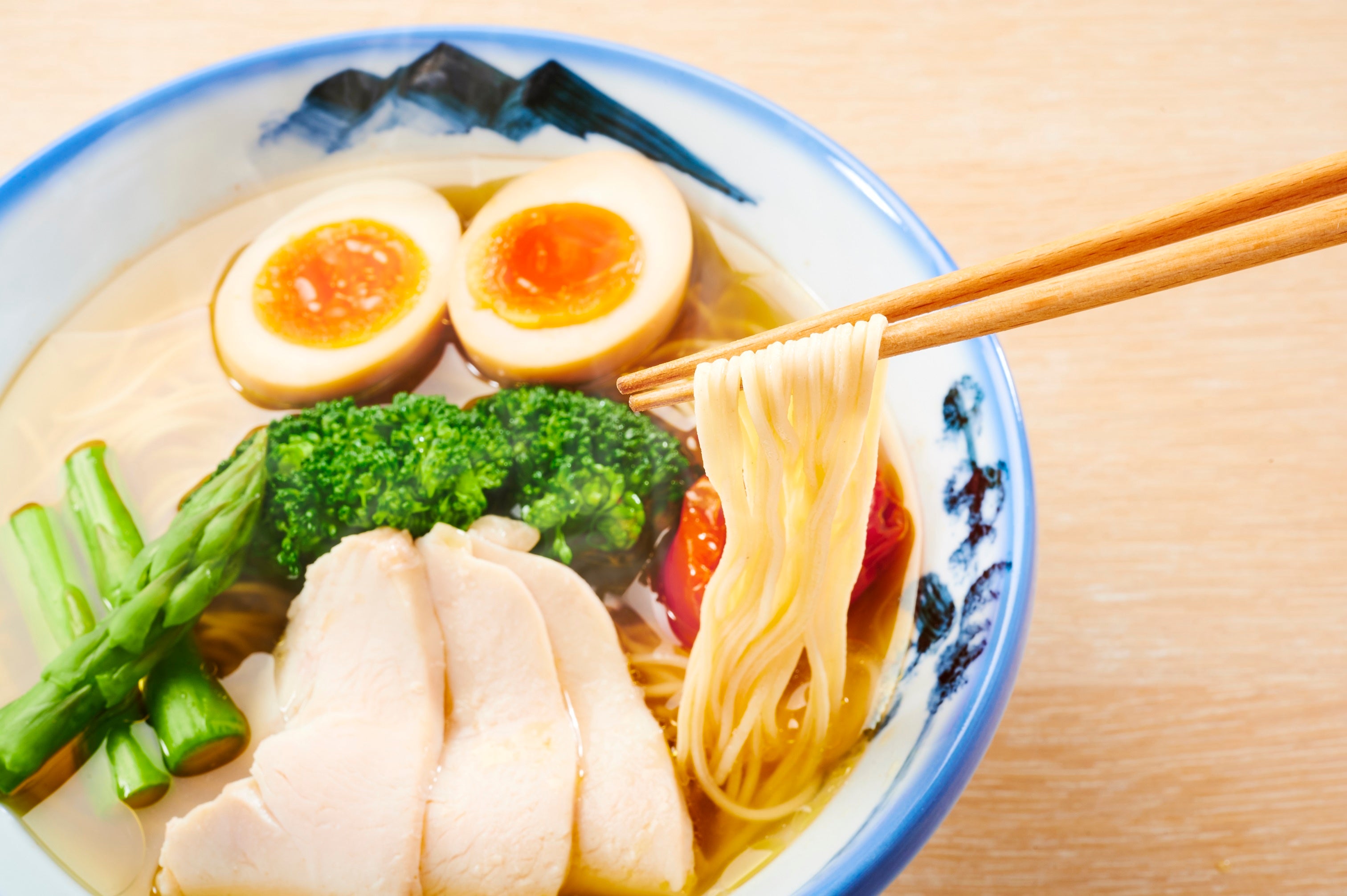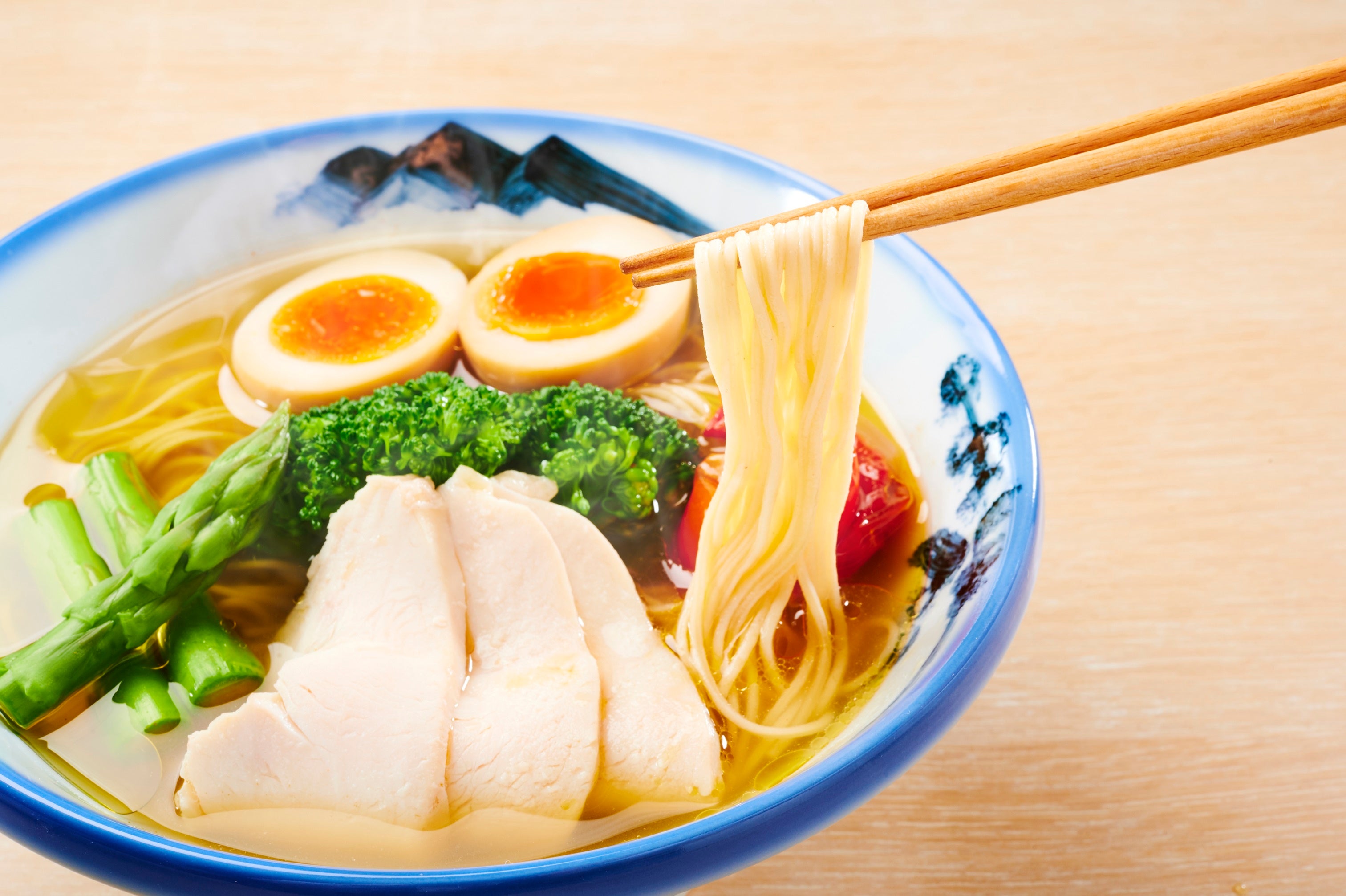 「AFURI」の看板商品である「柚子塩らーめん」のスープに、大豆を50%配合した低糖質・高たんぱく麺「キッコーマン 大豆麺 細麺」(※)を使っています。(※麺には小麦も使用しています)