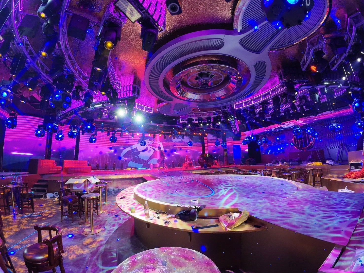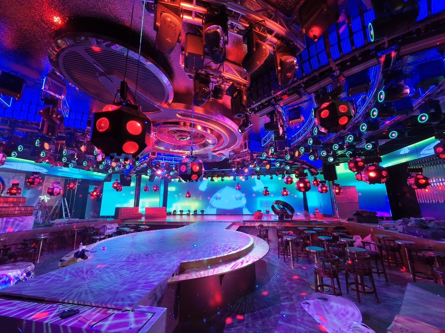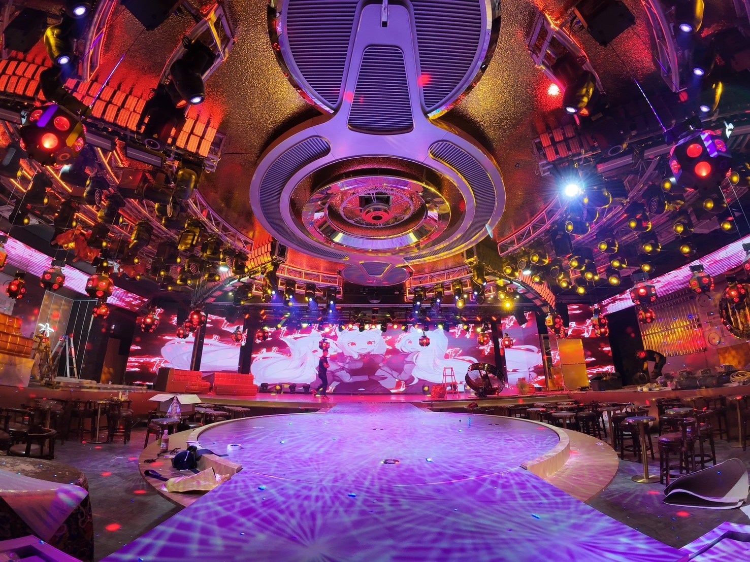 店内の内装は、すべて同社FND梶岡が手掛け、約400台の演出照明がダンサーを輝かせ。