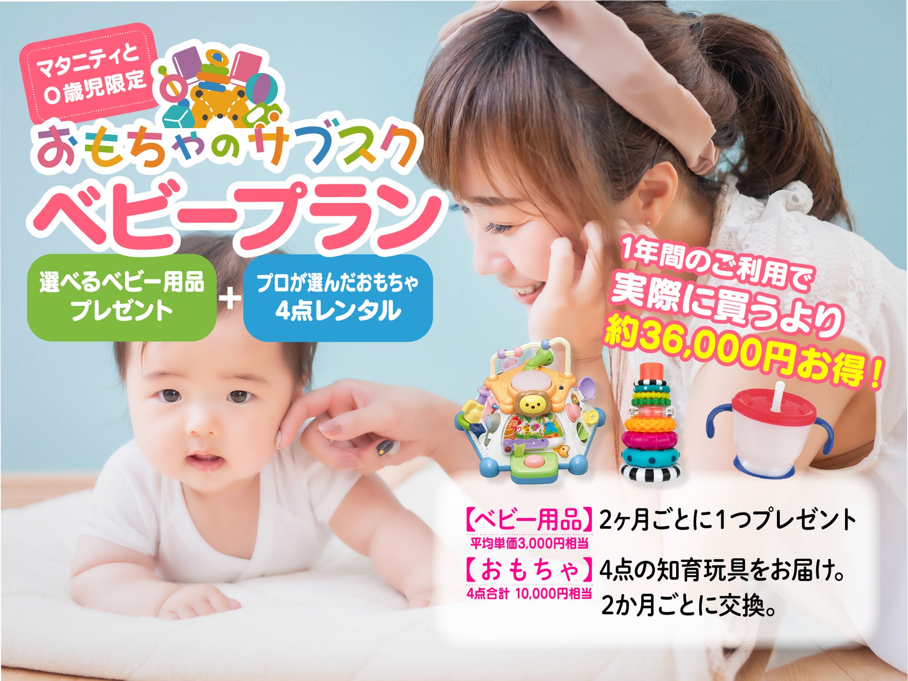 知育玩具のサブスクリプションサービス 「おもちゃのサブスク」では、「家で知育をしたいが、どんなおもちゃを選んだらいいのかわからない」「家で子どもと過ごす時間を充実させたい」「何かと物入りなマタニティ〜0才の時期、家庭の支出を少しでも減らしたい」といったご要望にお応えし、知育玩具と必需のベビーグッズを一つのパッケージで組み合わせた新しいサブスクリプションプランを、マタニティ〜0才児をお持ちの親御さんに向けてリリースしました。