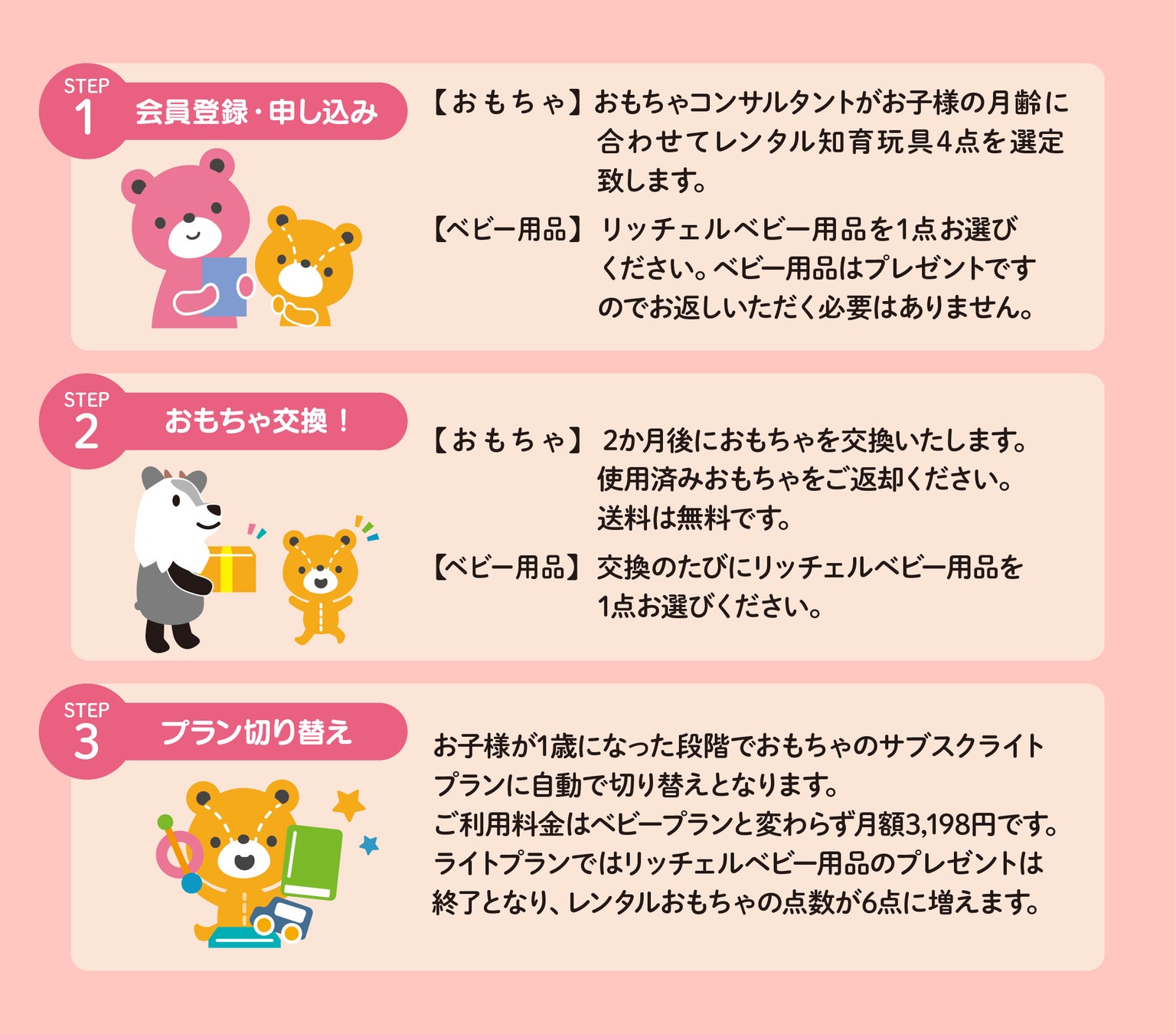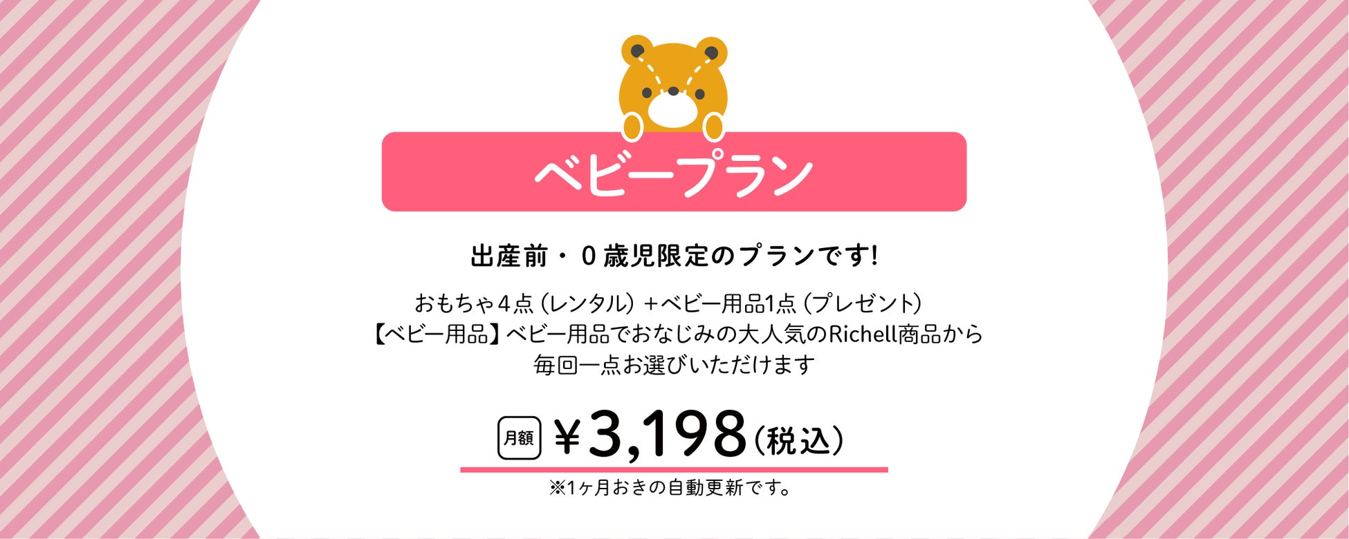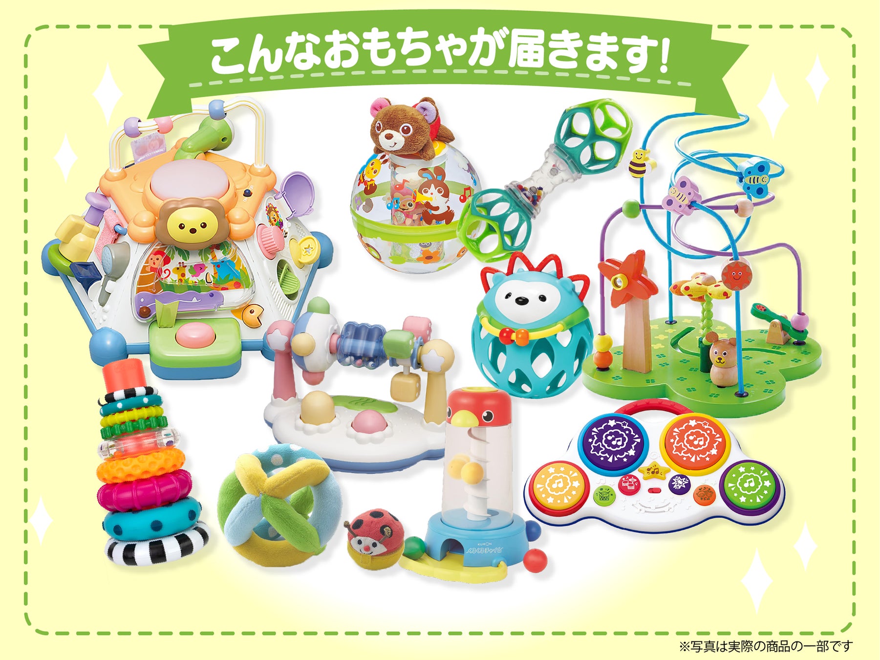 10,000円相当の知育玩具4点(レンタル) + 3,000円相当のベビー用品1点(プレゼント)をお届けいたします。