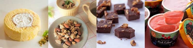 左から、岐阜県の飛騨コシヒカリの米粉を使用した無添加のロールケーキ。北海道の十勝産大豆を使用した、低糖質のグラノーラ。福井県の有機米玄米粉を使用した、グルテンフリーのブラウニー。福岡県の農産物にこだわった無香料・無着色のジェラート。