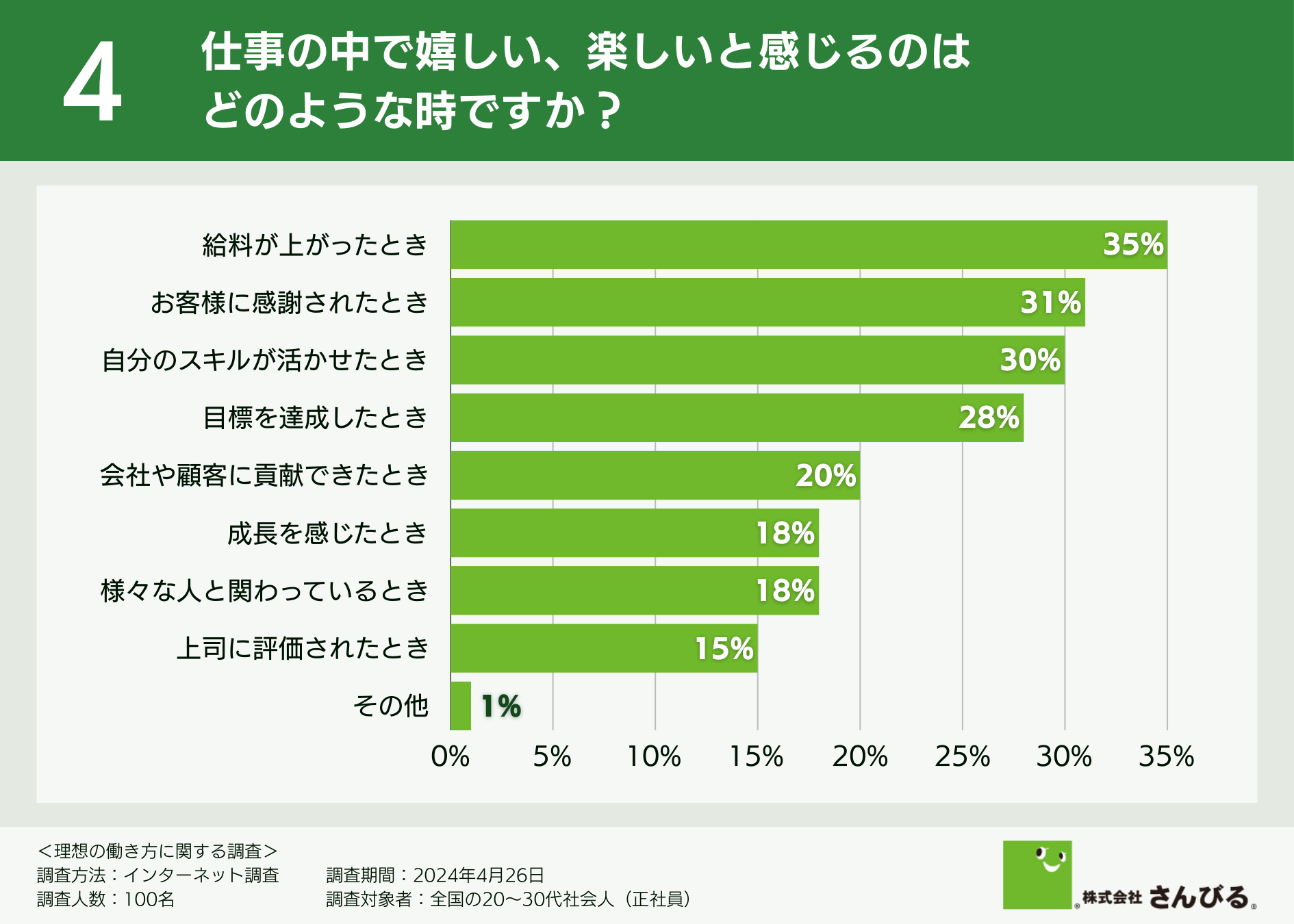 そこで、仕事の中で嬉しい、楽しいと感じるのはどのような時なのか伺ったところ、「給料が上がったとき(35.0%)」「お客様に感謝されたとき(31.0%)」「自分のスキルが活かせたとき(30.0%)」という回答が集まりました。