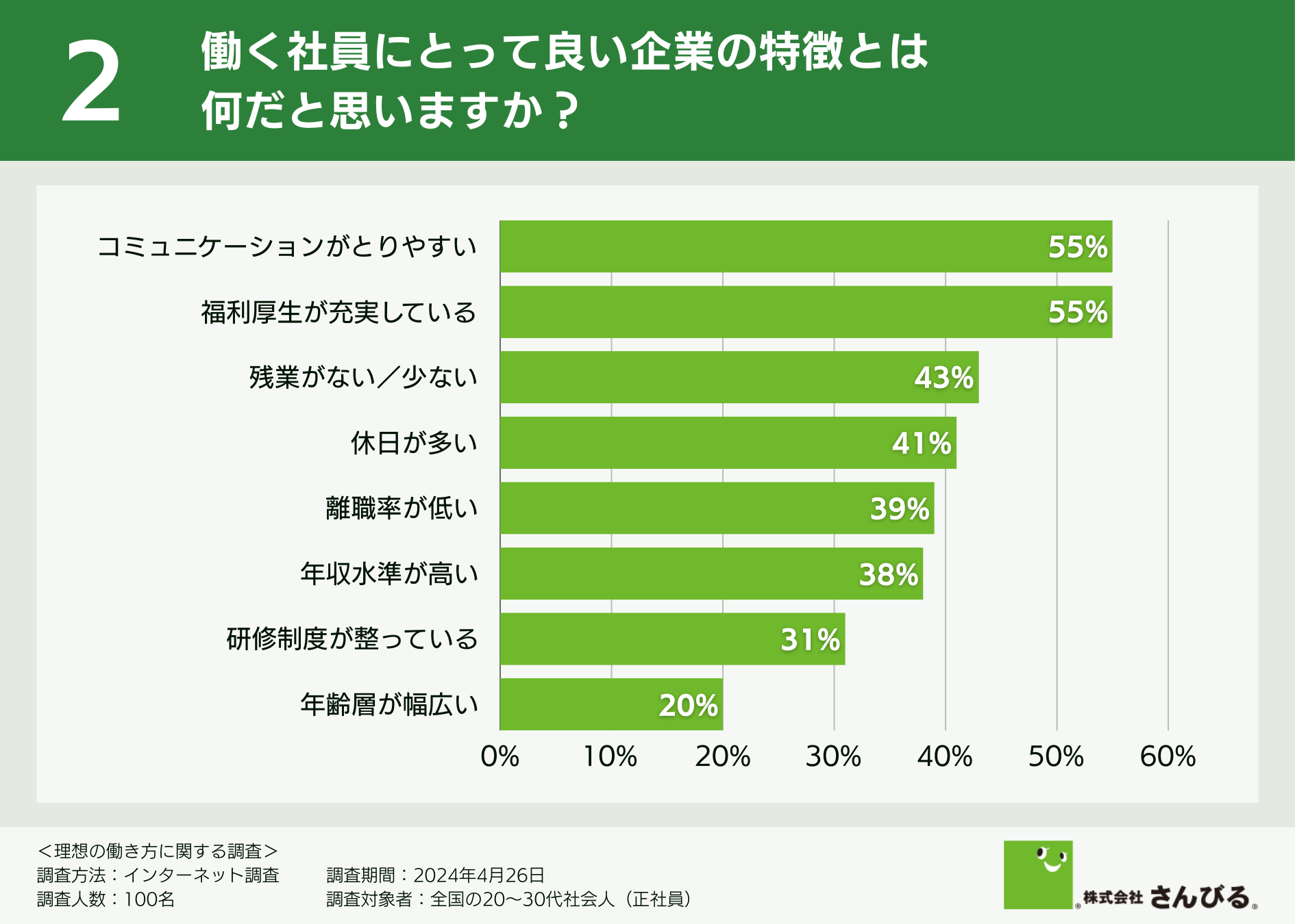 続いて、働く社員にとって良い企業の特徴とは何だと思うか伺ったところ、「コミュニケーションがとりやすい(55.0%)」「福利厚生が充実している(55.0%)」「残業がない/少ない(43.0%)」という回答が集まりました。