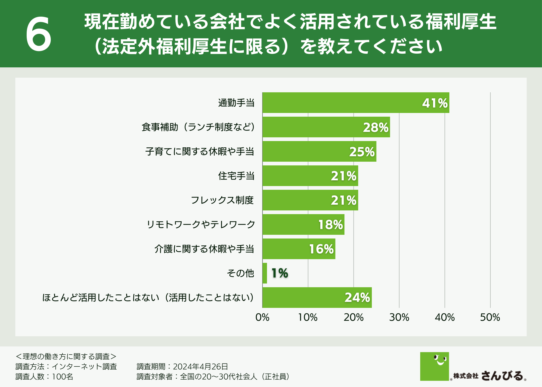 そこで、現在勤めている会社でよく活用されている福利厚生について伺ったところ、「通勤手当(41.0%)」「食事補助(ランチ制度など)(28.0%)」「子育てに関する休暇や手当(25.0%)」という回答が集まりました。