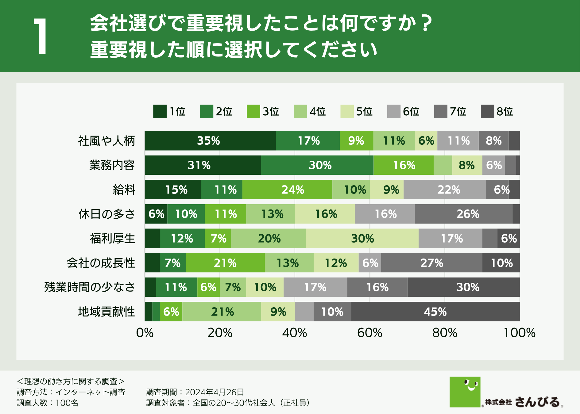 はじめに、会社選びで重要視したことについて重要視した順に伺ったところ、「社風や人柄」を最も重要視するという方が35.0%で最多となりました。
