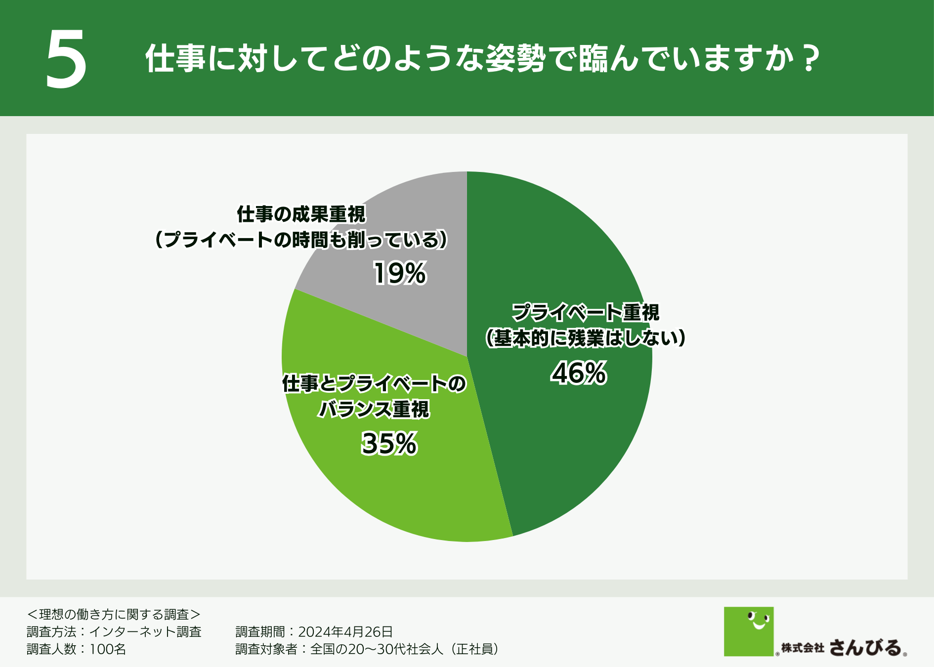 次に、仕事に対してどのような姿勢で望んでいるか伺ったところ、「プライベート重視(基本的に残業はしない)(46.0%)」「仕事とプライベートのバランス重視(35.0%)」「仕事の成果重視(プライベートの時間も削っている)(19.0%)」という結果が集まりました。