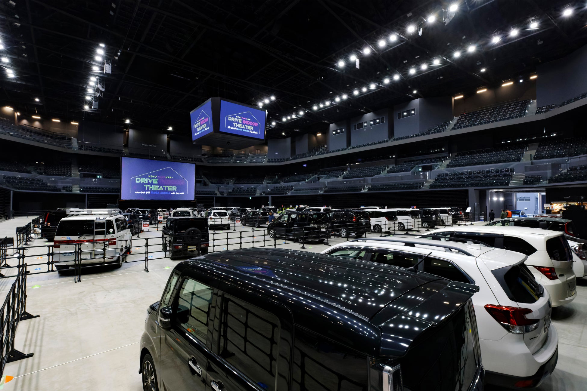 SAGAアリーナの中に自分の車で乗り入れて横16メートル、縦 9メートルの大スクリーンに映し出される映像と大迫力のサウンドで映画を観られる、屋内型のドライブインシアター企画です。自分の車だけでなくアリーナ内の一般席でも会話や飲食をしながら自由に鑑賞ができ、従来のスポーツ観戦や音楽ライブにとどまらず、SAGAアリーナの新たな楽しみ方を提案する目的で企画されました。