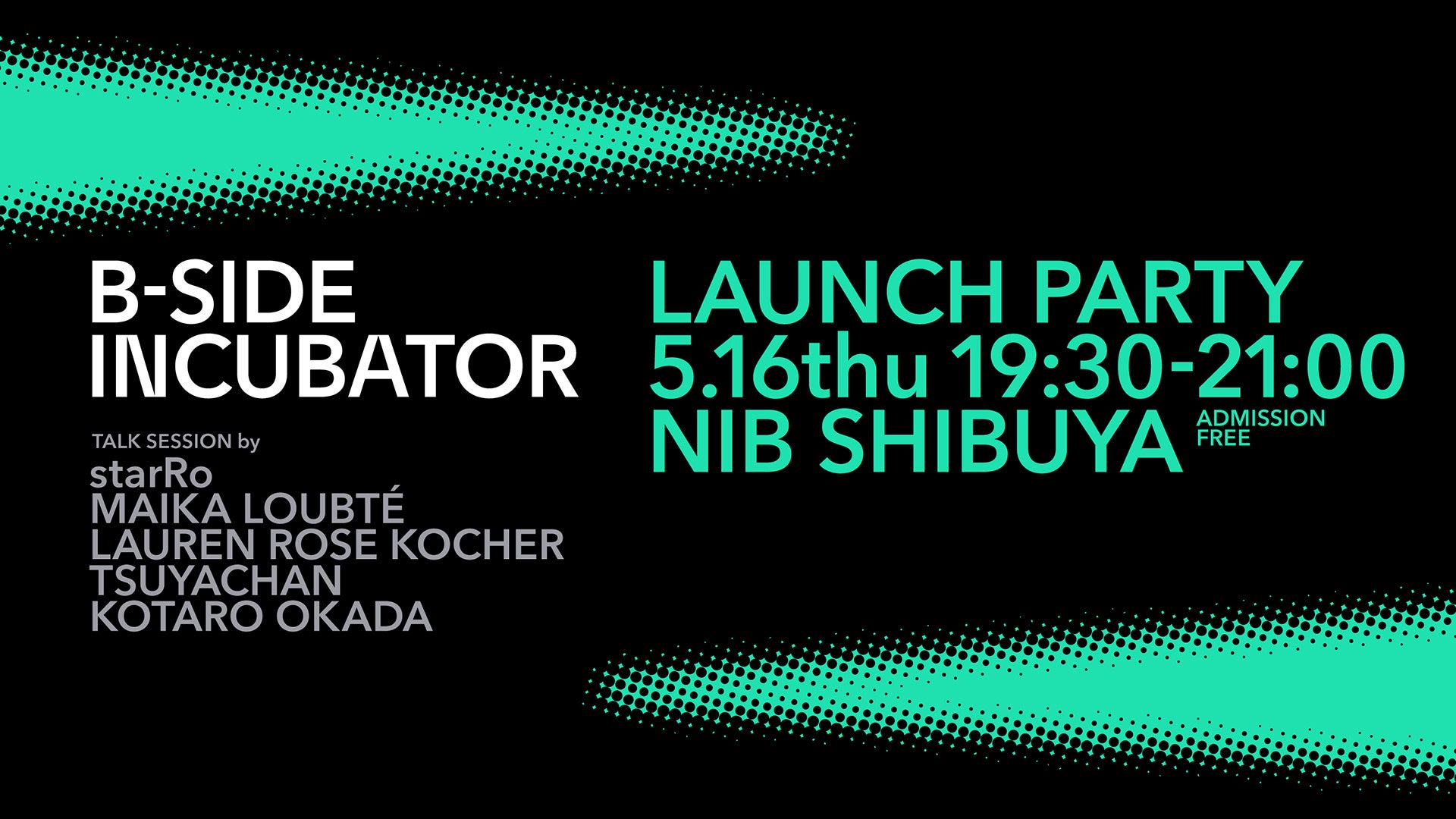 B-Side Incubatorの立ち上げを記念して、5月16日(木)19:30よりイベント「B-Side Incubator Launch Party」を開催します。プロジェクトの紹介や理事メンバーによるトークセッションを起点に、会場にお越しいただいたみなさんと「インディペンデント・アーティストの未来」について議論を深めていきます。