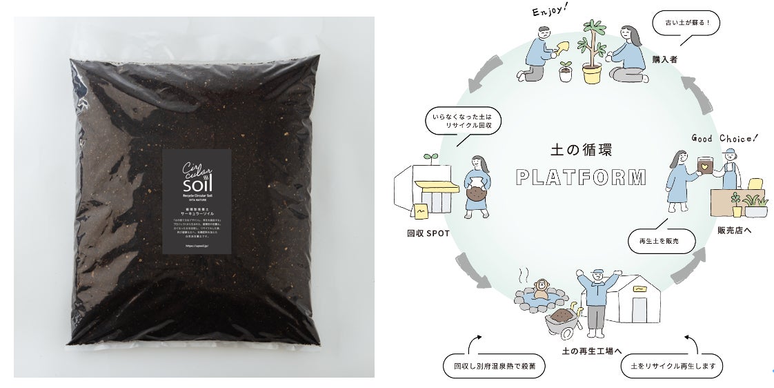 大切に回収した土を、別府温泉の蒸気で消毒処理を行い、破棄される植物の樹皮を粉砕して発酵させたバーク肥料と土の再生材アップソイルを加え、微生物や栄養分をたっぷりと含んだ健康な土へと再生しました。循環経済(サーキュラーエコノミー)をベースに商品開発を行なった、地球にやさしい持続可能な培養土です。