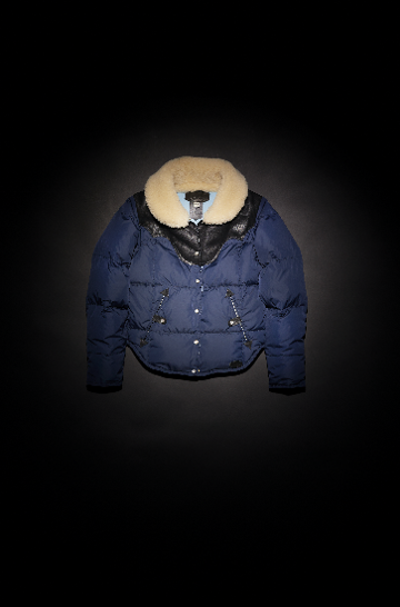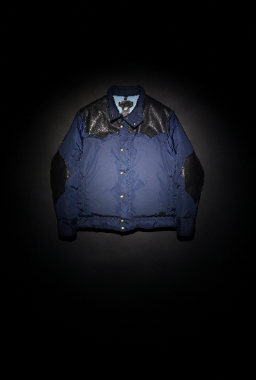 首回りの構造が他にない襟にもなりスタンドカラーにもなる特徴的なデザイン。また馬乗り、いわゆるライダーにとってまとわりつかない着丈短く重宝されるショート丈ダウンジャケット。
