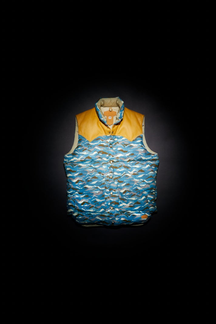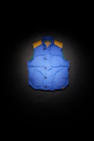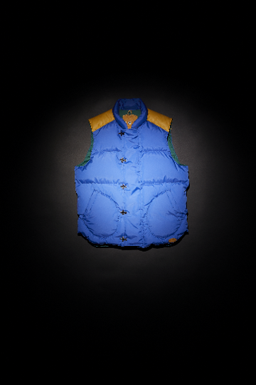 Rocky Mountain Featherbedのオーソドックスなデザインはそのままにナイジェル・ケーボンらしいファブリックセンスを生かしたダウンベスト。