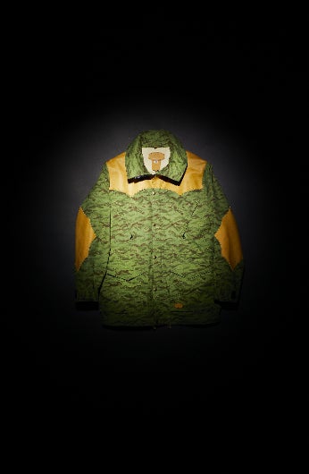 ハリー・スティーブンソン社のハイブリッドコットン生地を使用し、デジタルプリントされたマウンテンカモ柄を施す。生地の質感はややマットな仕上げ、雨や雪、風を防ぐだけでなく、汗などの不快な湿気も逃す。