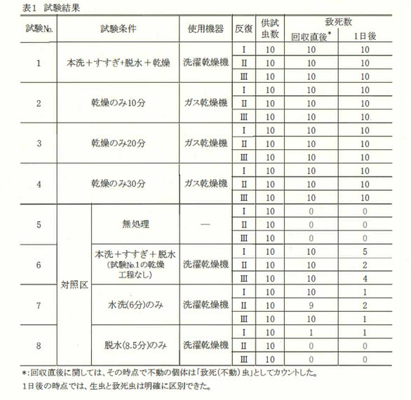 以上の結果から、コインランドリー用機器を使用してトコジラミを致死させるためには乾燥(加熱)工程が不可欠であり、10分以上の乾燥工程が加わることにより、衣類等にトコジラミが紛れ込んでいても完全に死滅させることができると判断された。