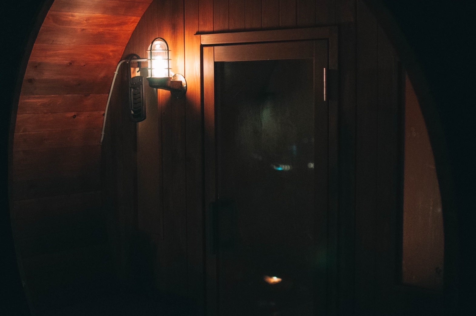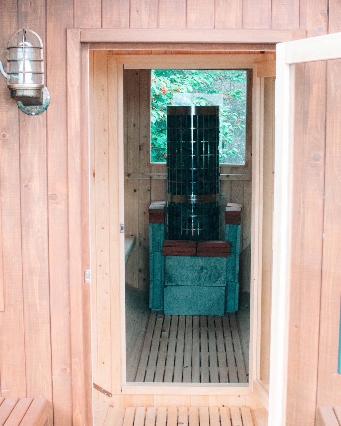 サウナエリアには国産ヒノキ木材を使ったバレルサウナ・水風呂・インフィニティチェア、