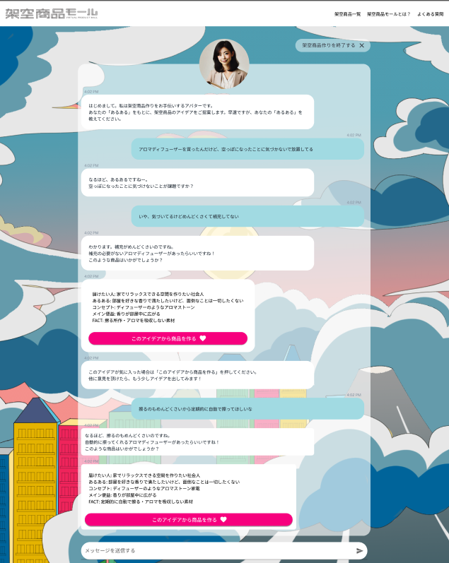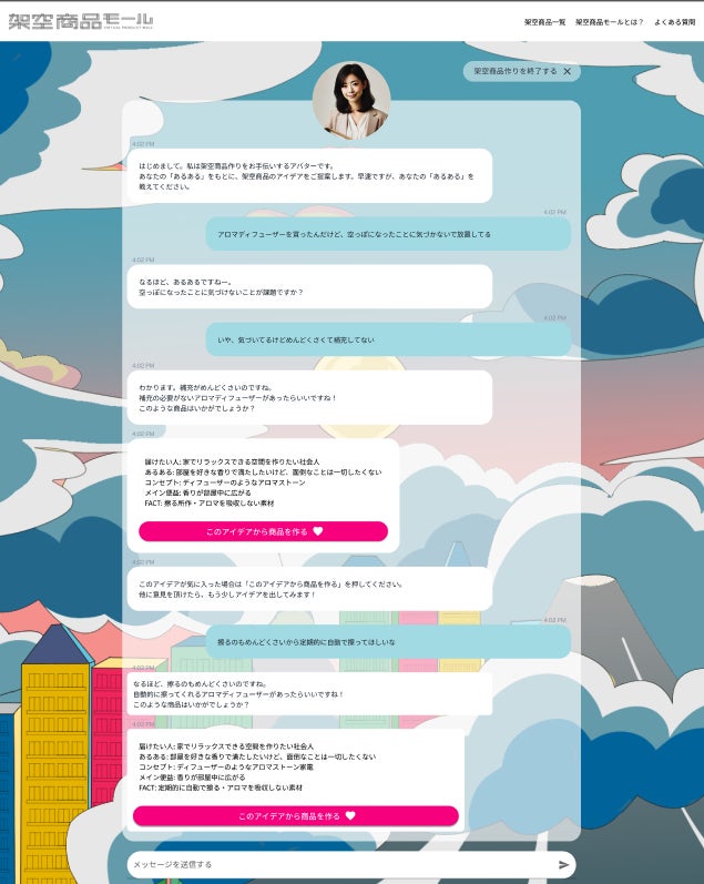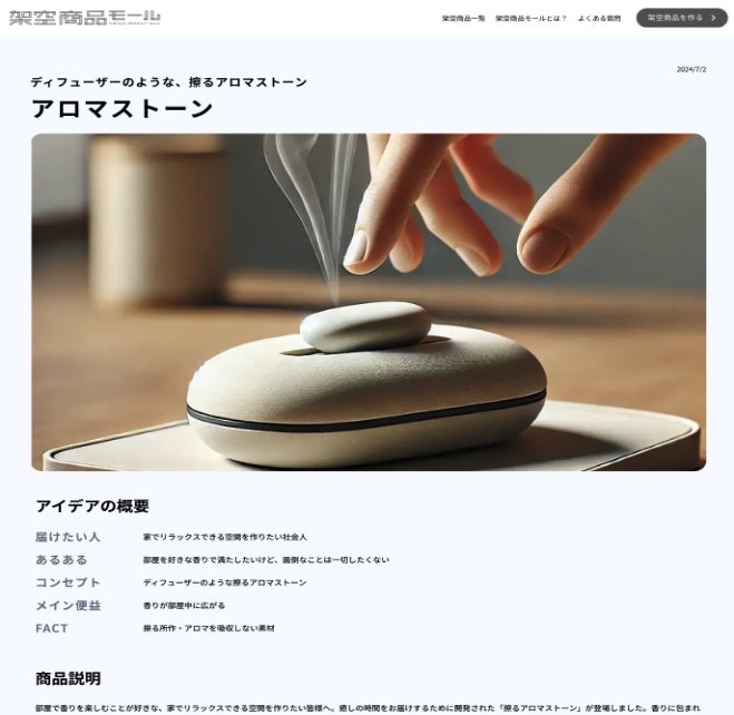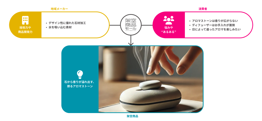 石材加工に強みを持つメーカーの技術力を学習したAI(アバター)が、「部屋を好きな香りで満たしたいけど、面倒なことは一切したくない」という生活者のニーズを引き出し、「アロマを吸収しない素材で、擦るだけで香りがあふれ出すアロマストーン」という架空商品を創造。