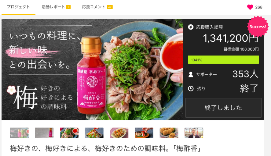 梅の調味料がどんな食べ物に合うかの調査からブランディング、「Makuake」での商品発表までを総合支援。2024年4月7日より「梅酢香」を販売開始し、合計353名、¥1,341,200の応援購入をいただきました。