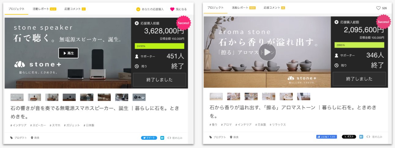 商品の企画・開発からブランディング、「Makuake」での商品発表、販売までを総合支援。2023年7月18日より「stone speaker」を販売開始し、合計451名、¥3,628,000の応援購入をいただきました。また、2024年2月19日より「aroma stone」を販売開始し、合計346名、¥2,095,600の応援購入をいただきました。