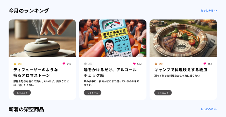 生活者が架空商品を投稿・シェアすることができ、どのくらい”欲しい”が集まるのかをランキング形式などで可視化することが可能。メーカーは、ランキングや架空商品に集まる生活者からの反応をもとに商品化の検討が可能なため、需要予測が立てやすくなります。