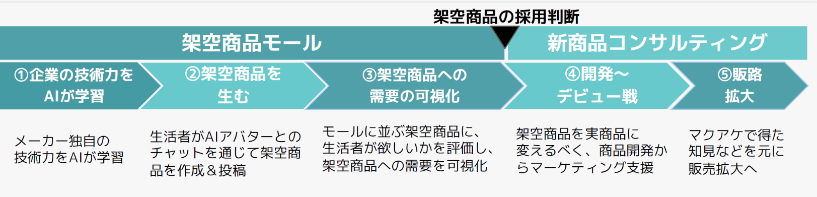 「架空商品モール」とは、「AIがメーカーの技術力と生活者のニーズを組み合わせて独自の商品アイデア(架空商品)を提案する機能」と、「どの架空商品にどれだけの賛同が得られるかを可視化する機能」をもった、これまでにない新しい形の新商品開発プラットフォームです。生活者の体験価値を創り、メーカーや商品へのエンゲージメントを高めることで、商品開発前から多くのファン候補を集めることが可能です。