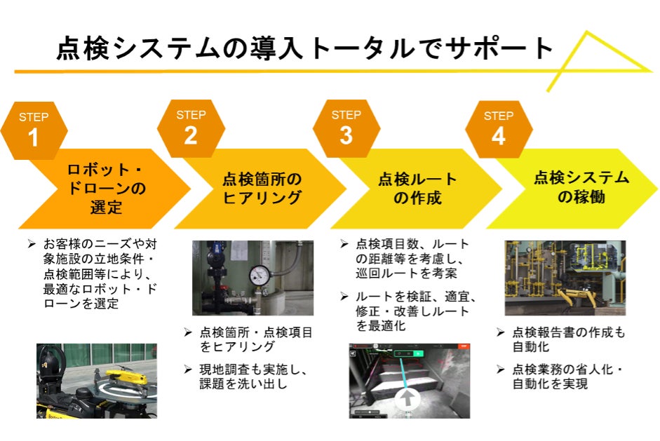今回、本格始動するロボティクス事業では、点検作業の自動化を支援するロボット・ドローンの販売及び導入支援を行います。お客様のニーズに合わせて最適なロボット・ドローンを選定し、点検箇所のヒアリングから施設内の巡回ルート選定、ルート検証・最適化、スケジュール構築まで、ロボット・ドローンを使用した点検システムの導入をトータルでサポート致します。